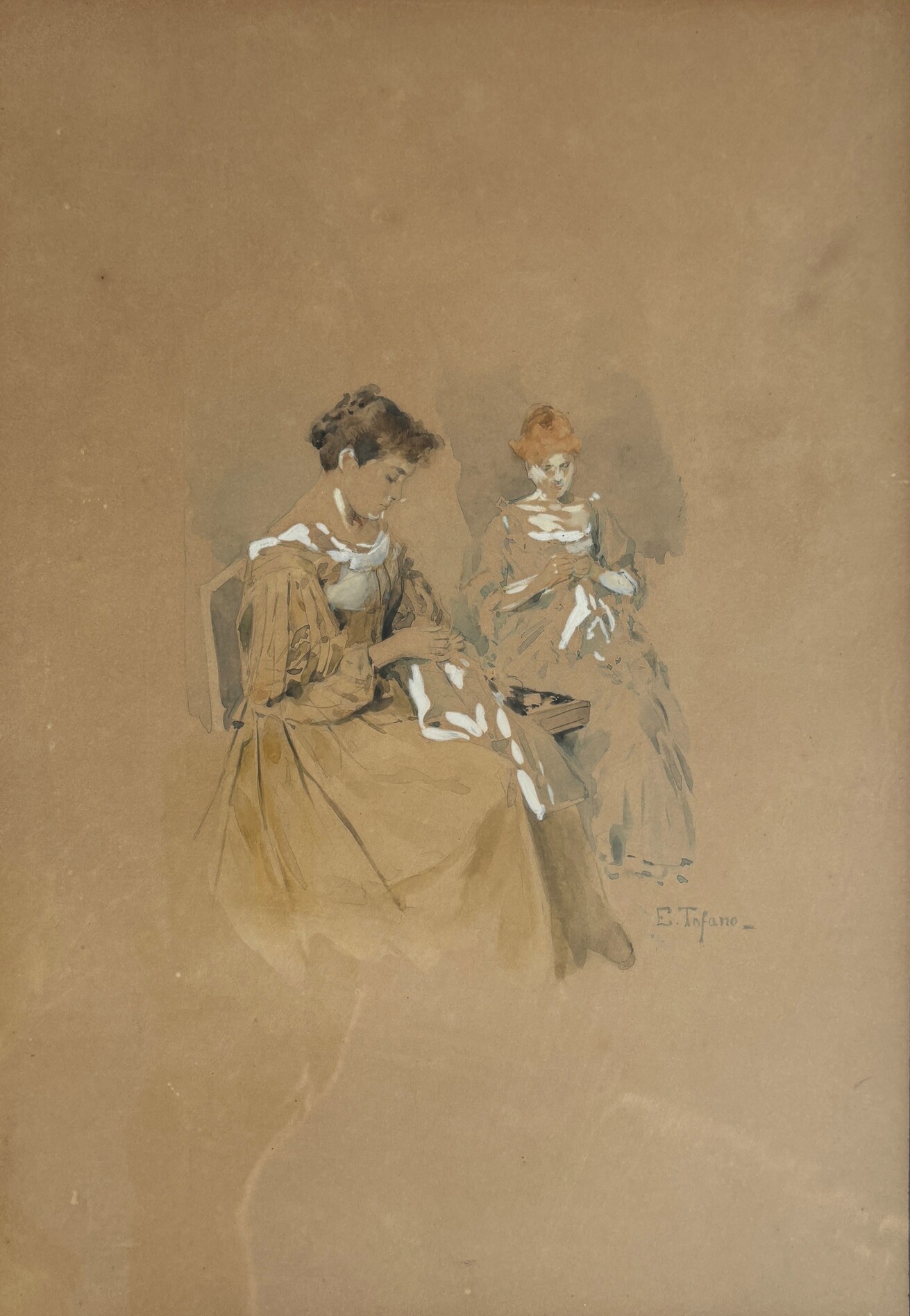 Edoardo Tofano (1838 - 1920) Donne che cuciono Acquerello e grafite su carta 34 x 24 cm