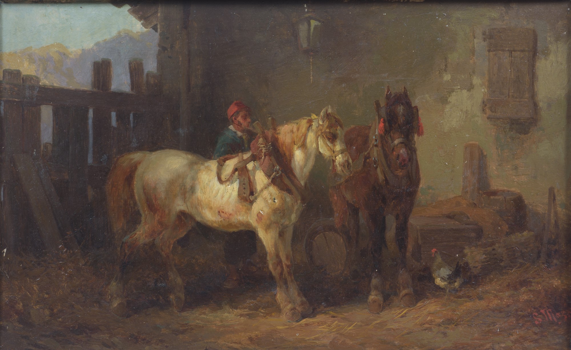 Salvatore Mazza (1819 - 1886) Cavalli in riposo olio su tavoletta 23,5 x38 cm