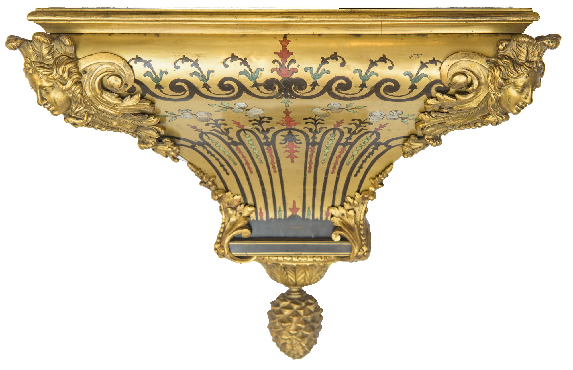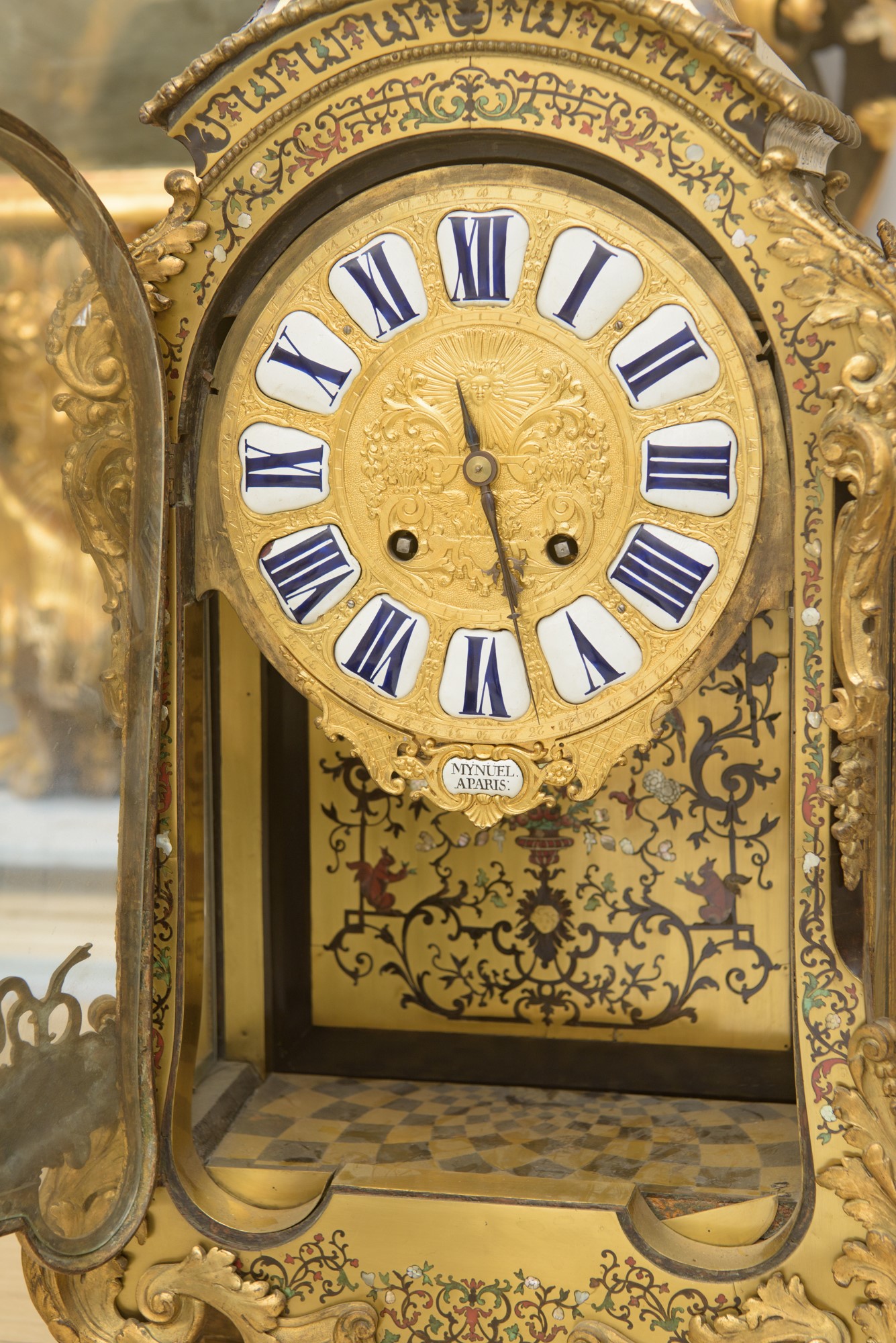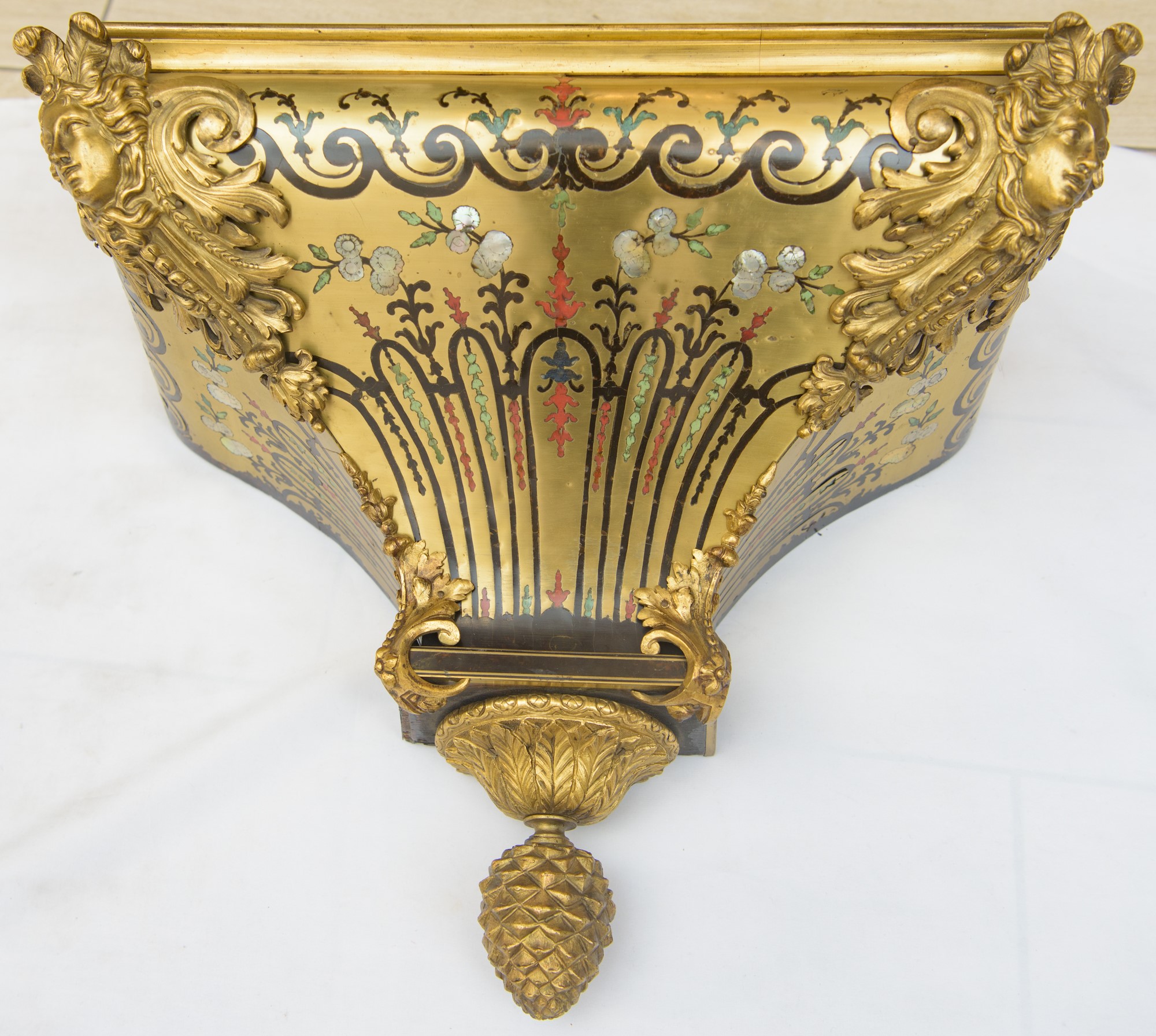 Monumentale pendola da parete con mensola, intarsiato à la Boulle, con importanti decori in bronzo dorato. Orologio con carillon situato nella base, collegato al treno della suoneria dell'orologio. Quadrante a numeri romani, incassati in riquadri decorati a smalto bianco, firmato Mynuel à Paris. Suoneria ore e mezze su campana con sistema a ruote spartiore e carillon. Meccanica da revisionare. Dimensioni mensola: H. 40 cm.