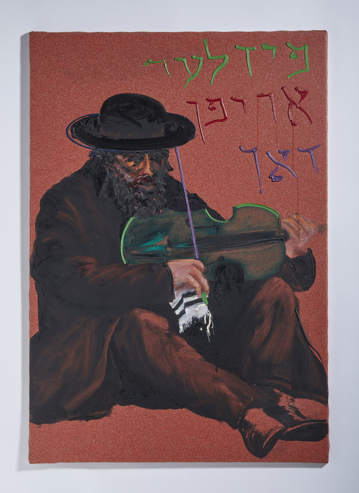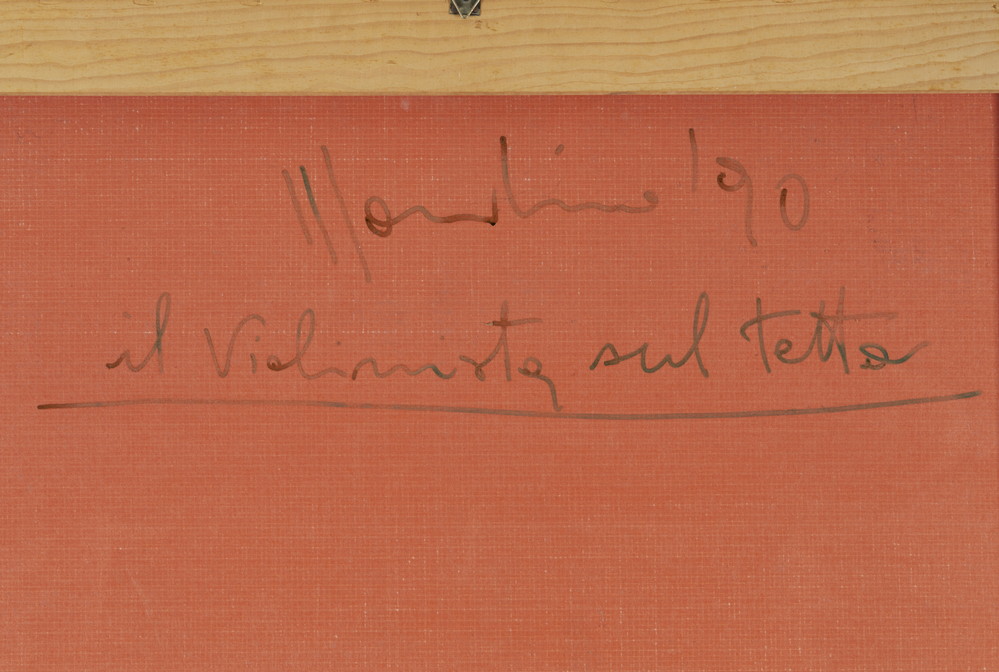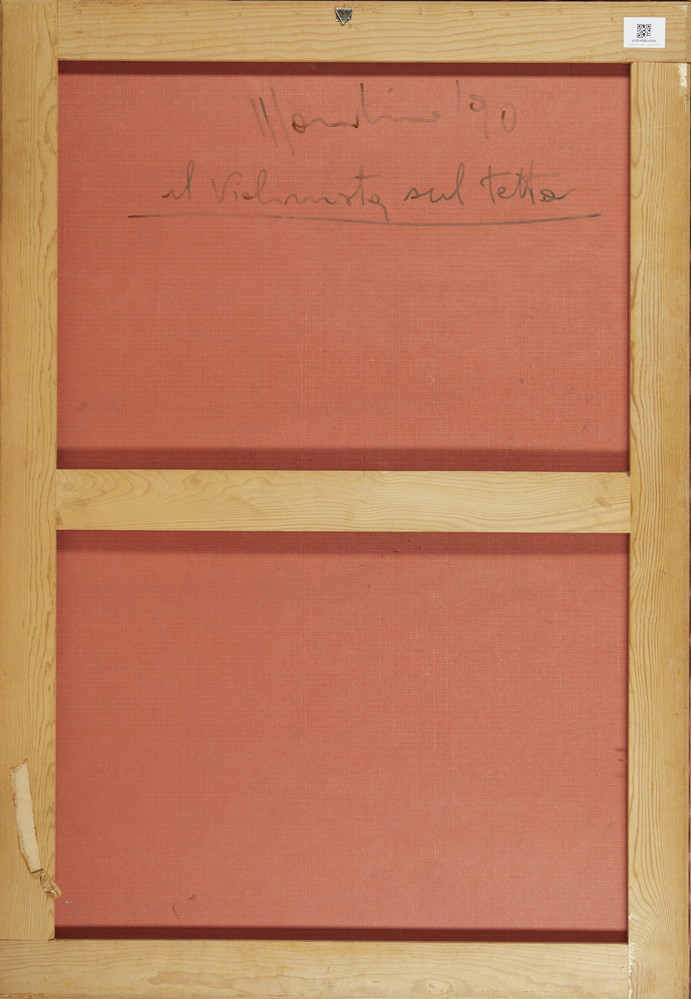 MONDINO ALDO (1938 - 2005) IL VIOLINISTA SUL TETTO. 1990. Tecnica mista su linoleum. Cm 90,00 x 130,00. sul retro: firma, data, titolo