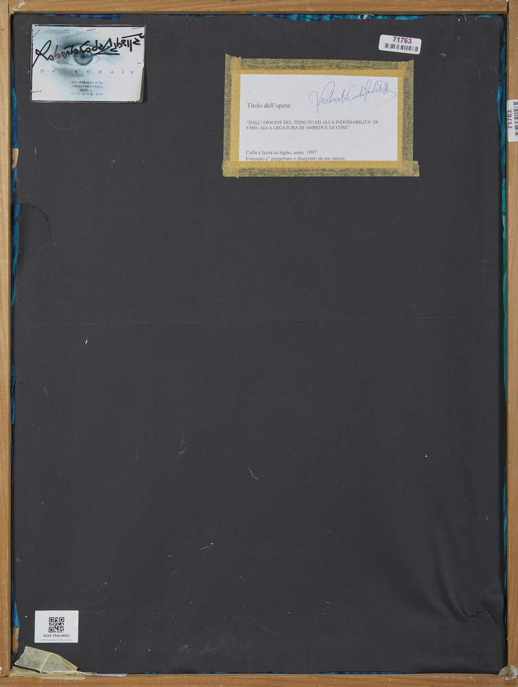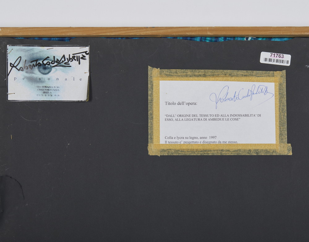 CODA ZABETTA ROBERTO (n. 1975) DALL'ORIGINE DEL TESSUTO ED ALLA INDOSSABILITA' DI ESSO, ALLA LEGATURA DI AMBEDUE LE COSE . 1997. colla e lycra su legno. Cm 63,50 x 83,50. sul retro: firma, data e titolo