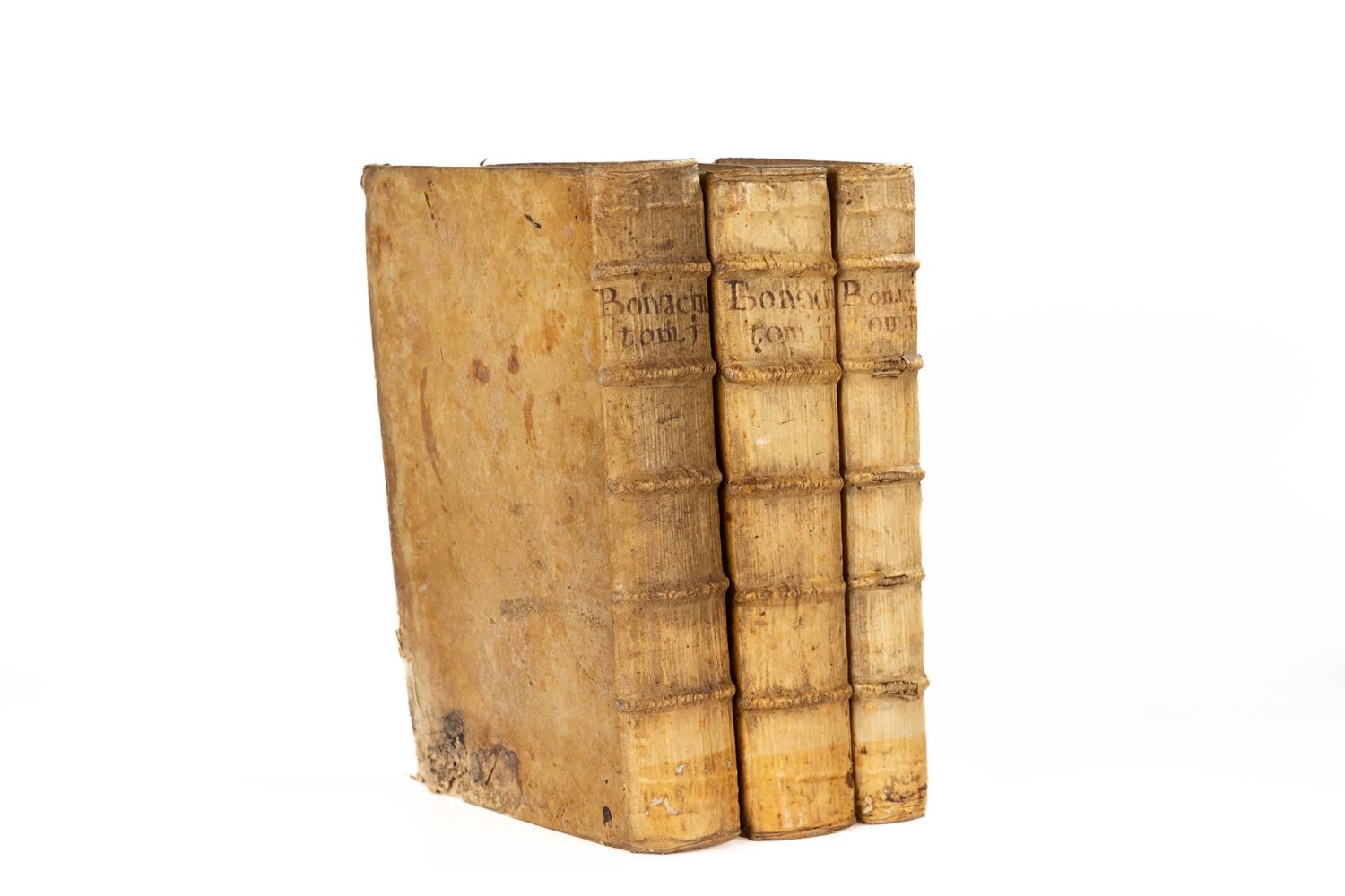 Tre volumi in-folio, rilegati in pergamena coeva, titoli calligrafati ai dorsi, pp. [24], 904, [76] - [12], 836, [52] - [16], 540, [28], esemplari in buone condizioni.
