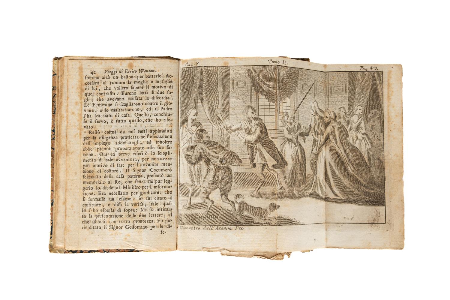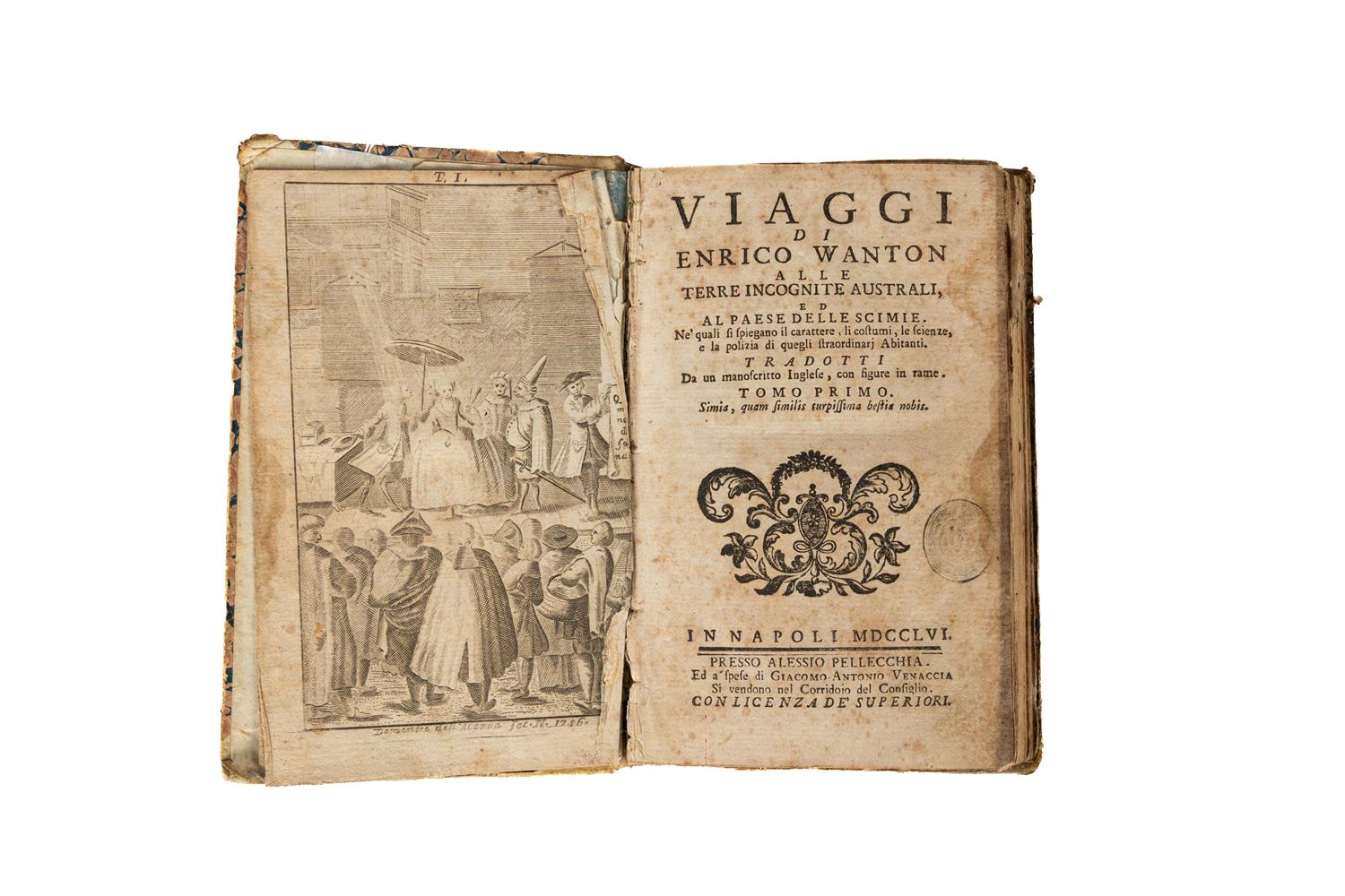 Viaggi di Enrico Wanton alle terre incognite australi, ed al paese delle scimie. Neʹ quali si spiegano il carattere, li costumi, le scienze, e la polizia di quegli straordinarj abitanti. Tradotti da un manoscritto inglese, con figure in rame.