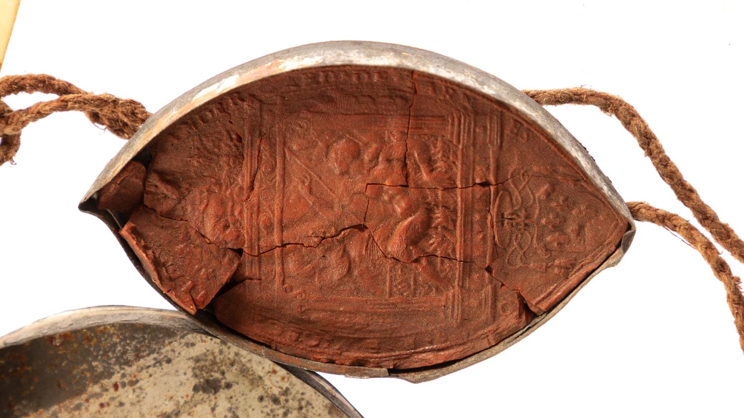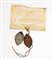 Frammento di pergamena del secollo XV°/XVI°, con sigillo cardinalizio in cera contenuto in capsula metallica.
