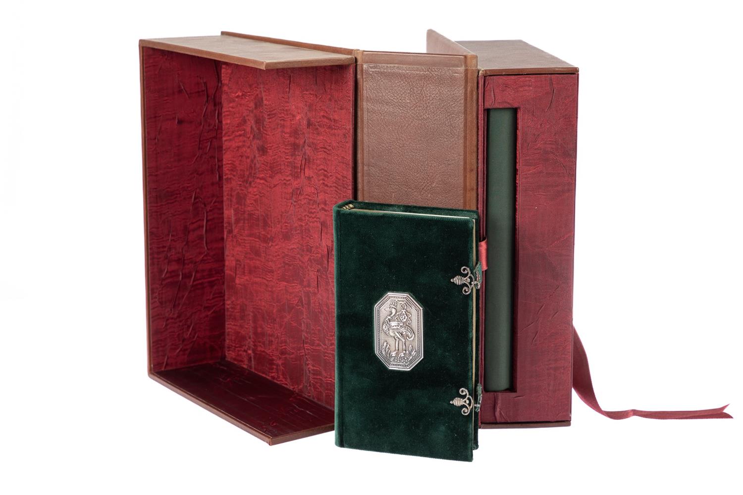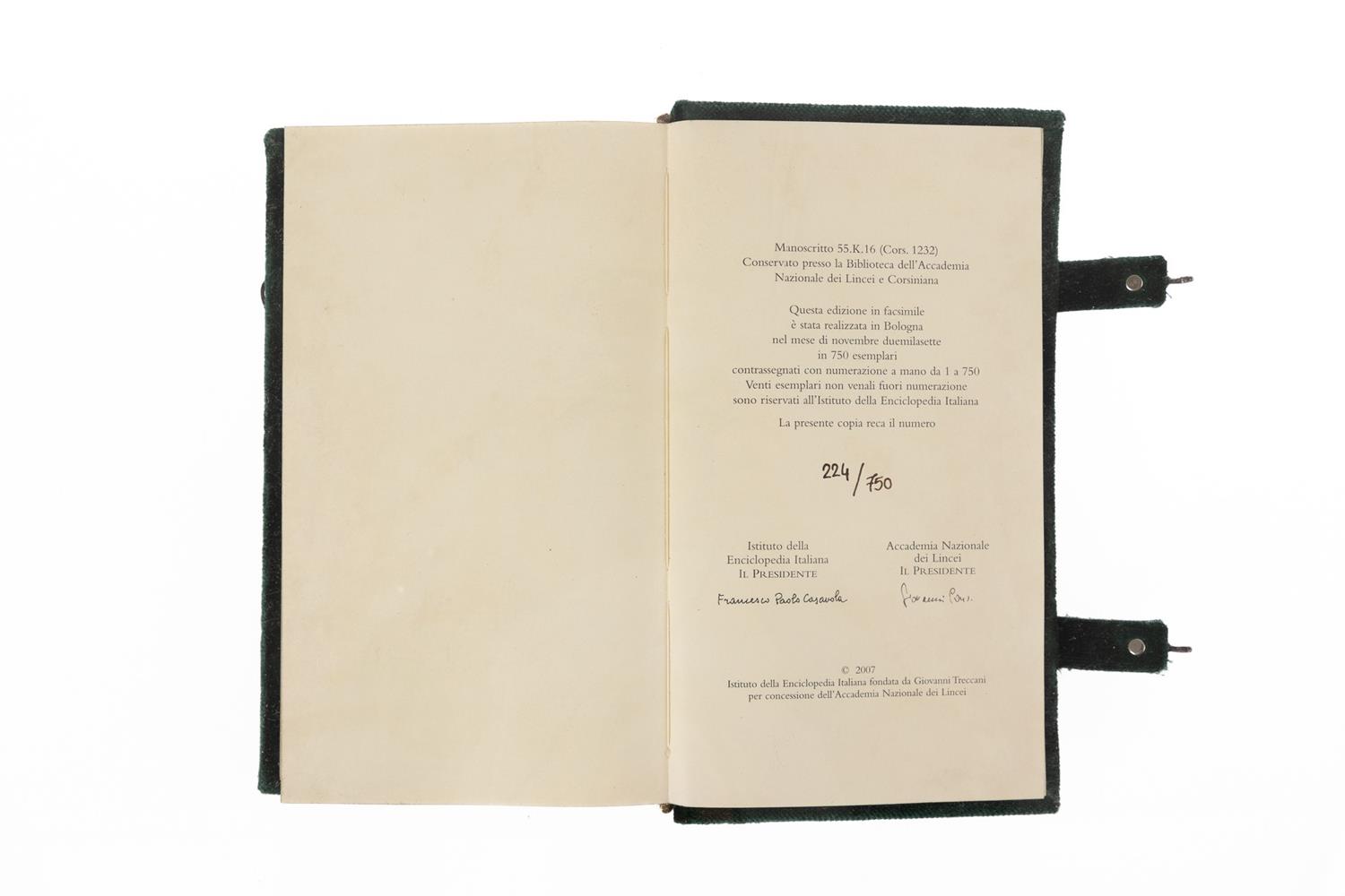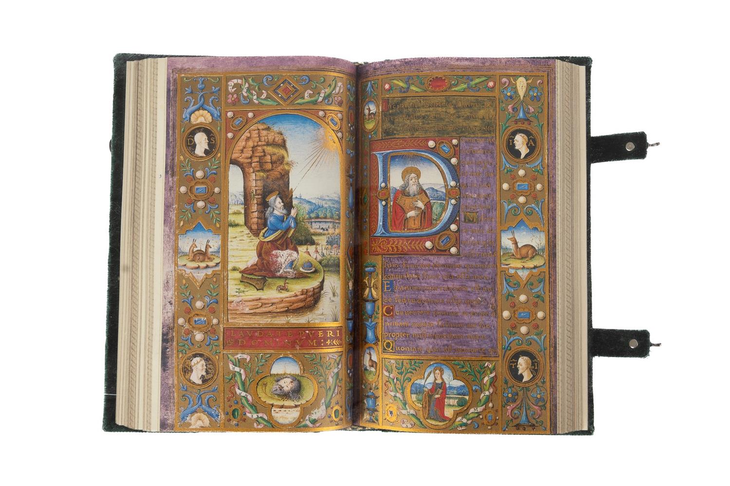 Formato 11×19 cm. di 300 pagine con sette miniature a piena pagina (attribuibili a Giovanni e Francesco Boccardi) e numerose iniziali decorate, in foglia d’oro. Nel cofanetto, in pelle, nel doppio scomparto oltre al codice (piatti in velluto verde, chiusure in argento e medaglione centrale) è conservato il commentario con saggi storici e paleografici.