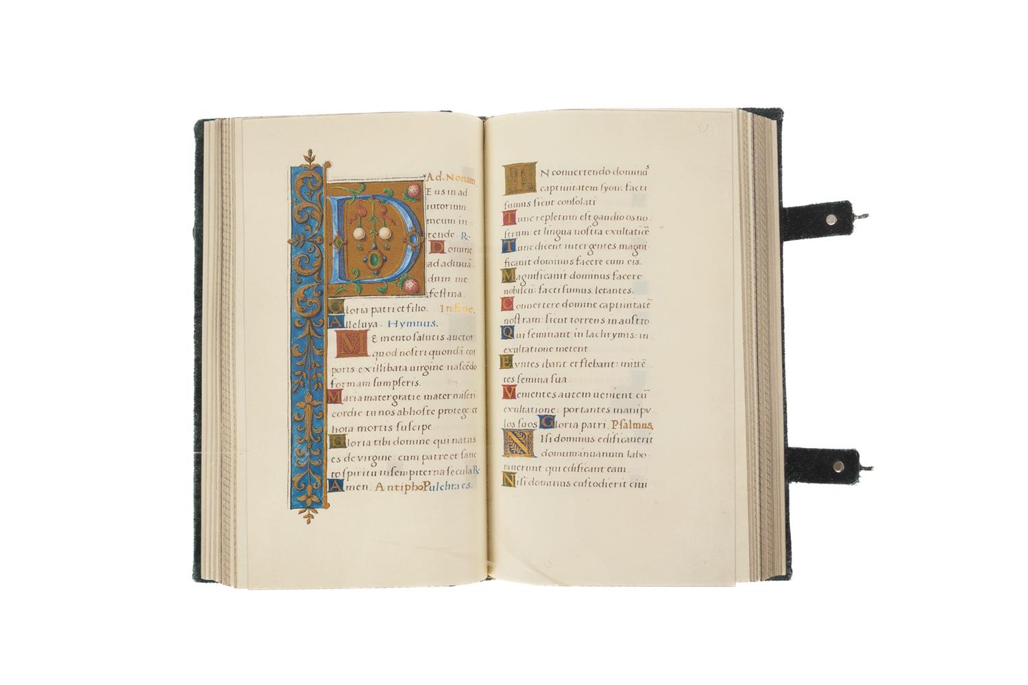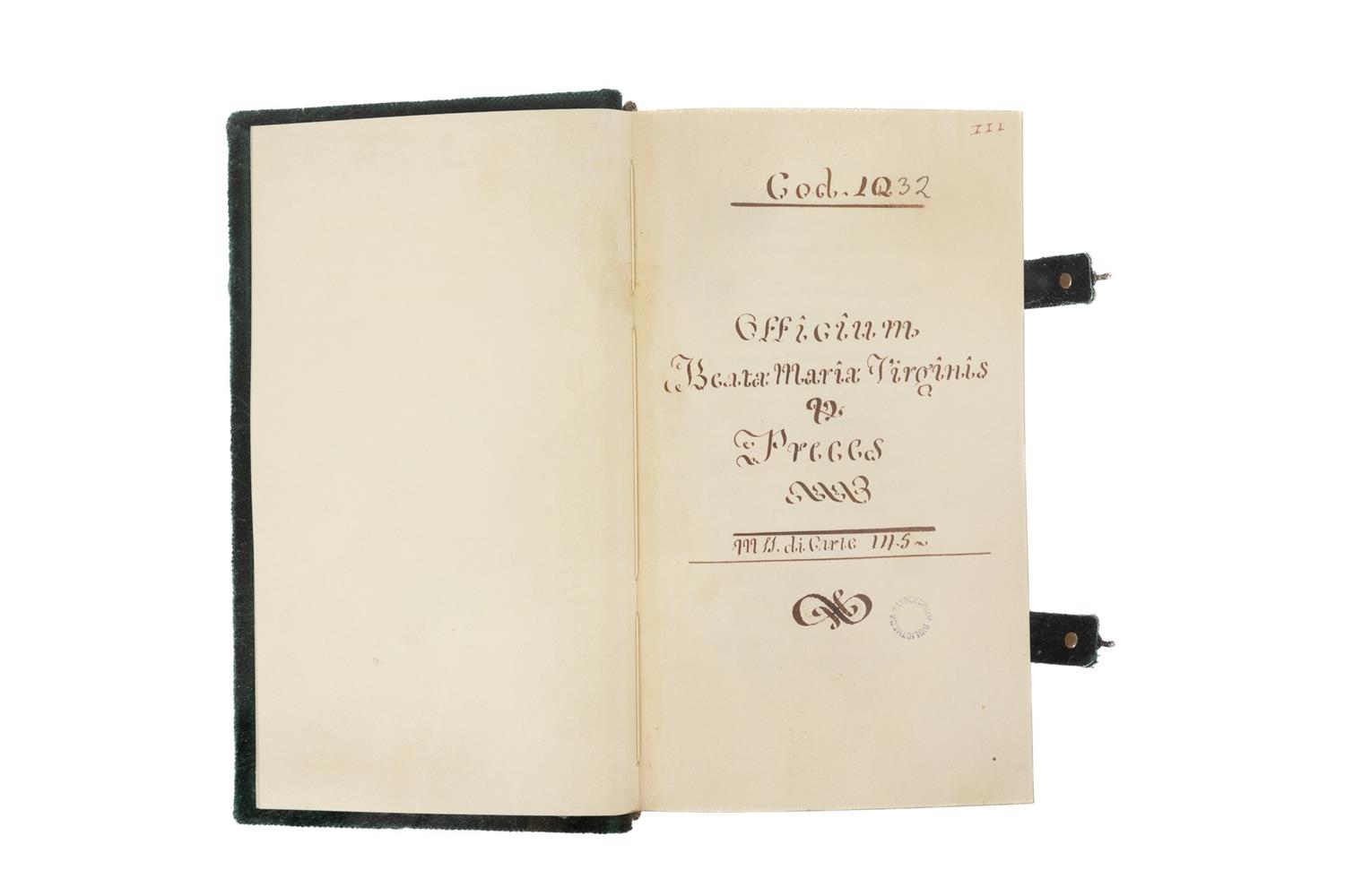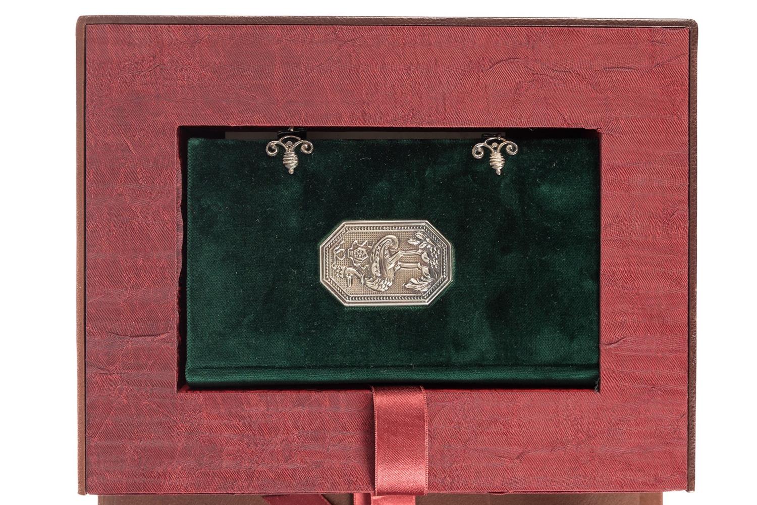 Formato 11×19 cm. di 300 pagine con sette miniature a piena pagina (attribuibili a Giovanni e Francesco Boccardi) e numerose iniziali decorate, in foglia d’oro. Nel cofanetto, in pelle, nel doppio scomparto oltre al codice (piatti in velluto verde, chiusure in argento e medaglione centrale) è conservato il commentario con saggi storici e paleografici.
