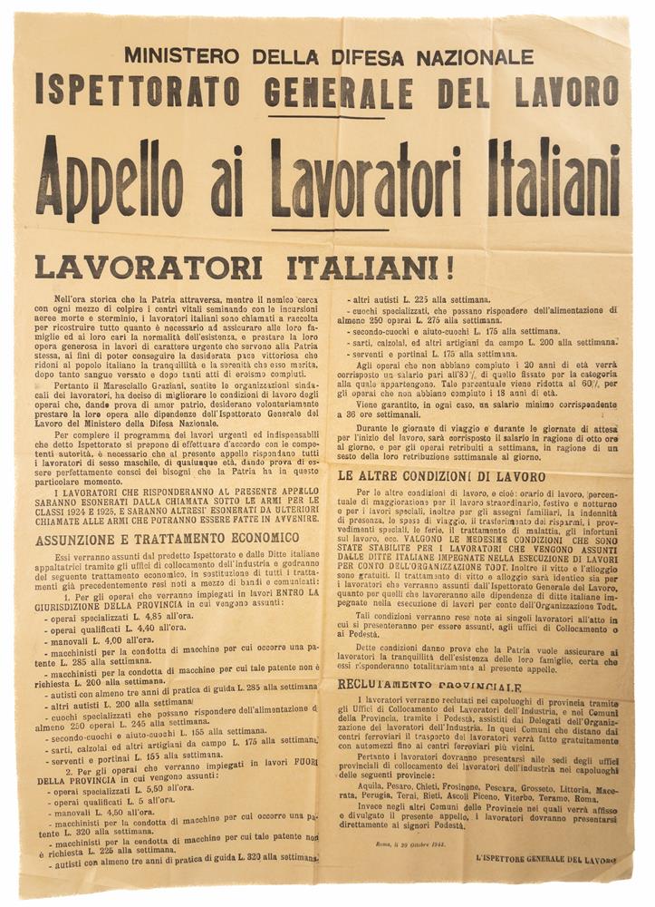 Manifesto ʺAppello ai Lavoratori Italianiʺ del Ministero della Difesa Nazionale - Ispettorato Generale del Lavoro,