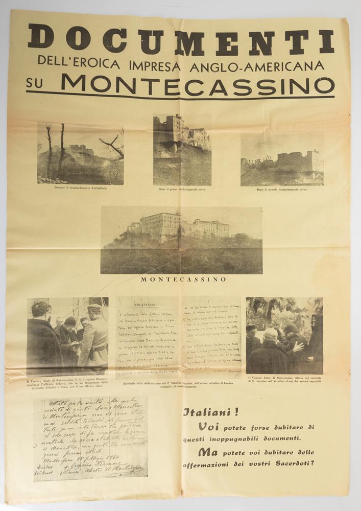 Manifesto riportante documenti fotografici e lettere sullʹeroica impresa anglo-americana su Montecassino.