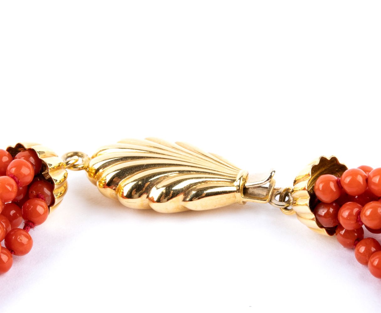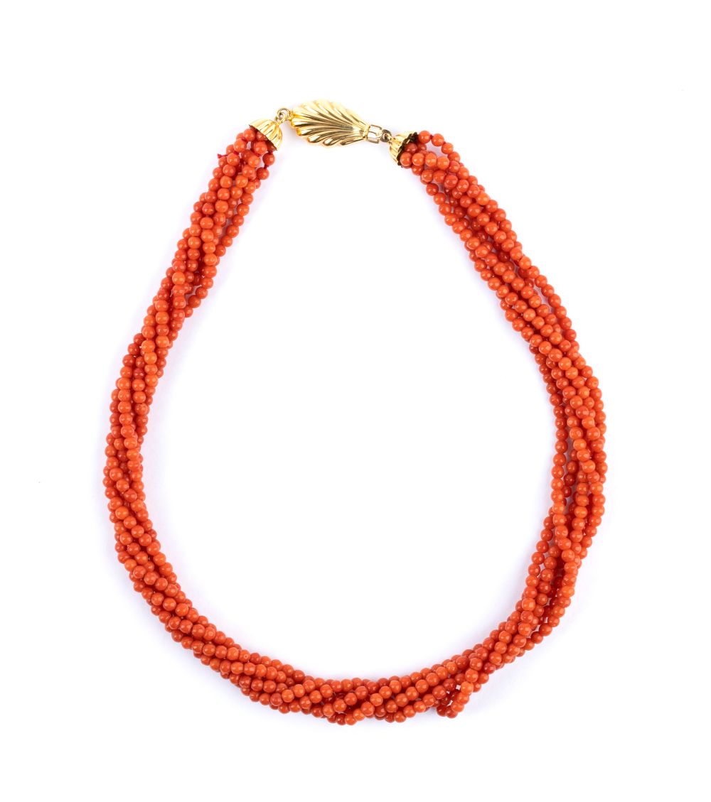 a sei fili di piccole sere di corallo Mediterraneo (corallium rubrum) con fermezza a forma di foglia in oro giallo 18k.