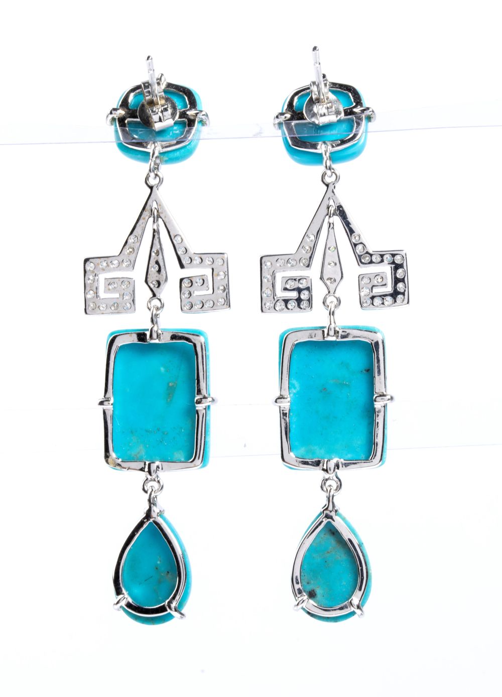 in oro bianco 18k, ciascuno con linea di cabochon geometrici di turchese naturale e nastri in diamanti rotondi taglio brillante.