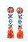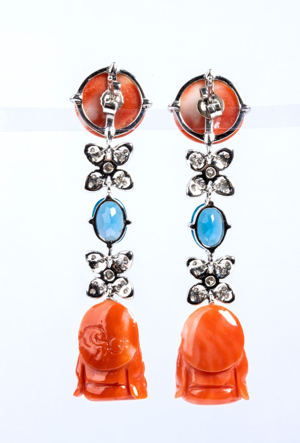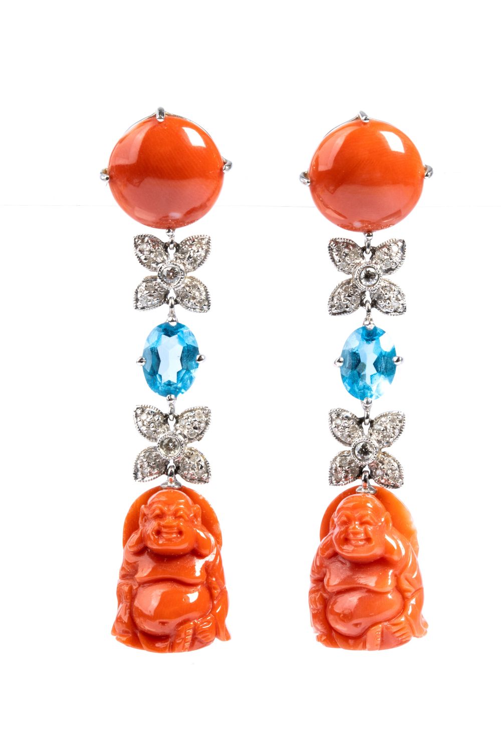 in oro bianco 18k, ciascuno decorato con corallo cerasuolo (corallium elatius) scolpito, raffigurante il Buddha, sospeso ad una linea composta da una coppia di fiori in pavé di diamanti taglio brillante ed un topazio azzurro, sormontati da un cabochon rotondo di corallo cersuolo.