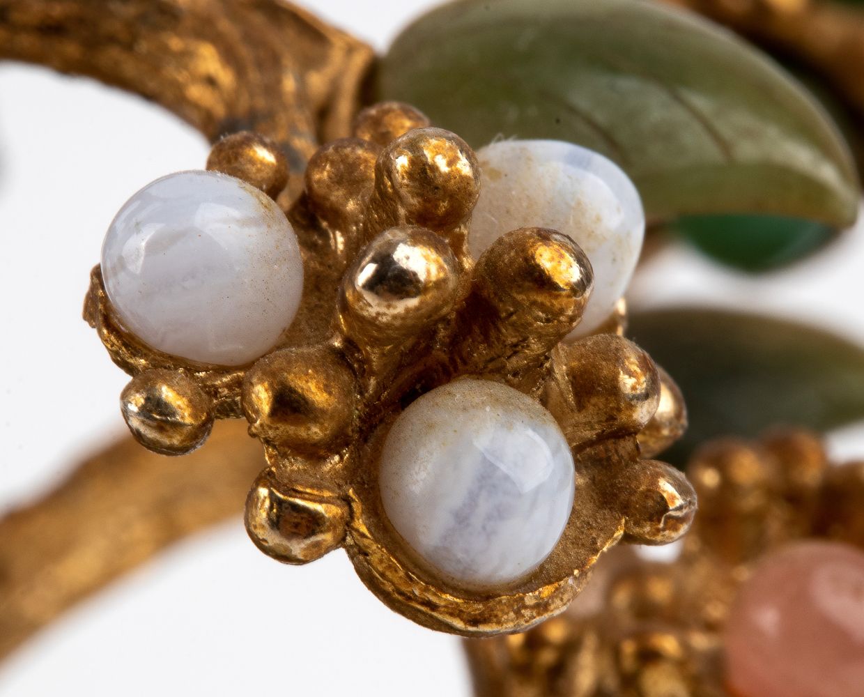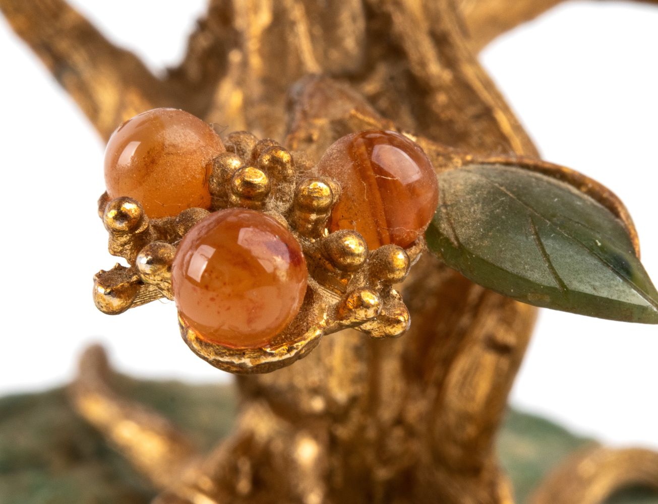 raffigurante un aberello con foglie in nefrite e piccoli frutti in sfere di corniola, turchese, agata, ametista, quarzo avventurina, radici posate su roccia serpeninte.