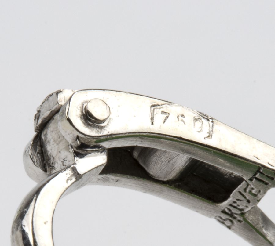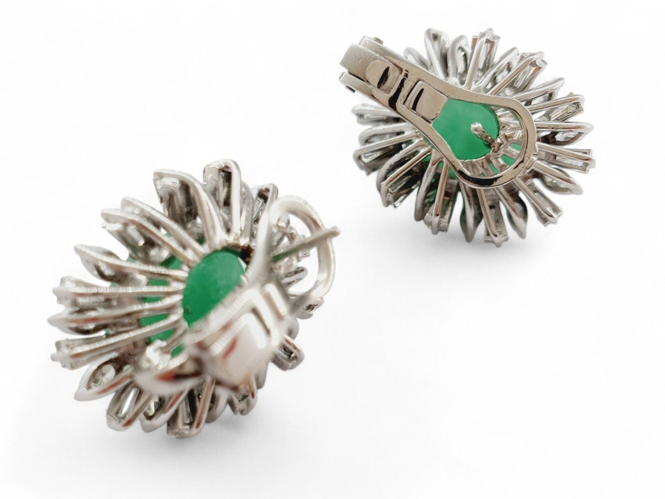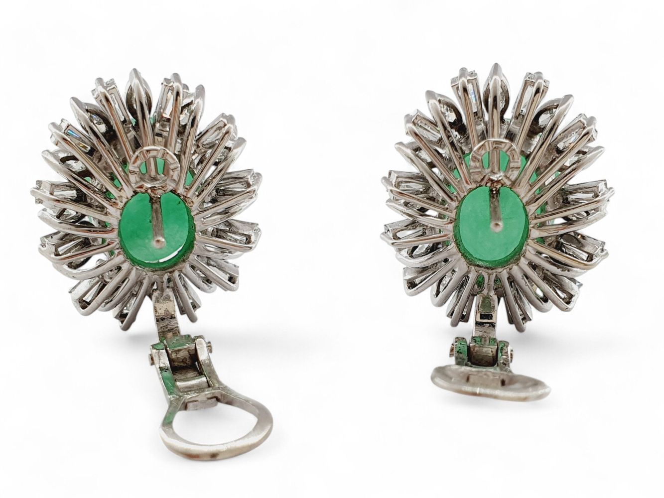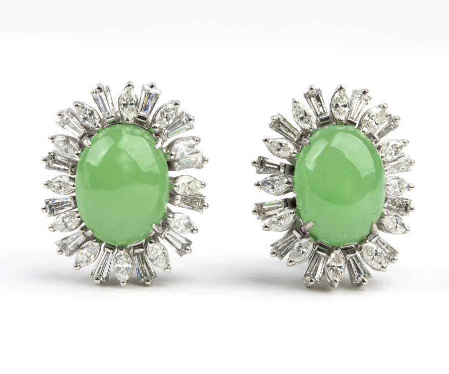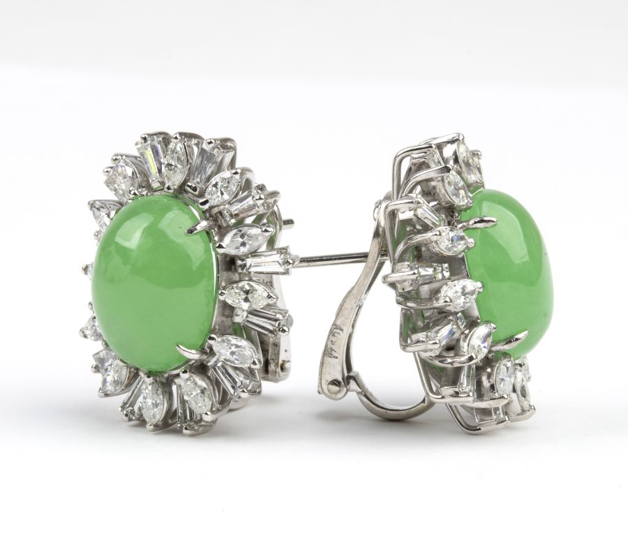 in oro bianco 18k, ciascuno con motivo a fiore incastonato con cabochon di giadeite verde incorniciata da diamanti di forma a navetta e trapezoidale.