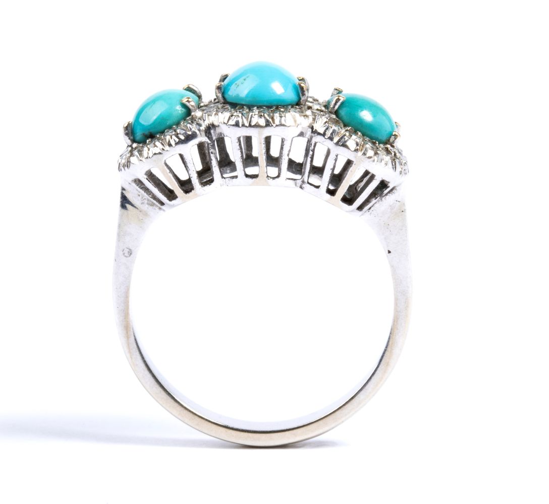 Anello oro bianco con tre motivi a fiore in turchese e diamanti