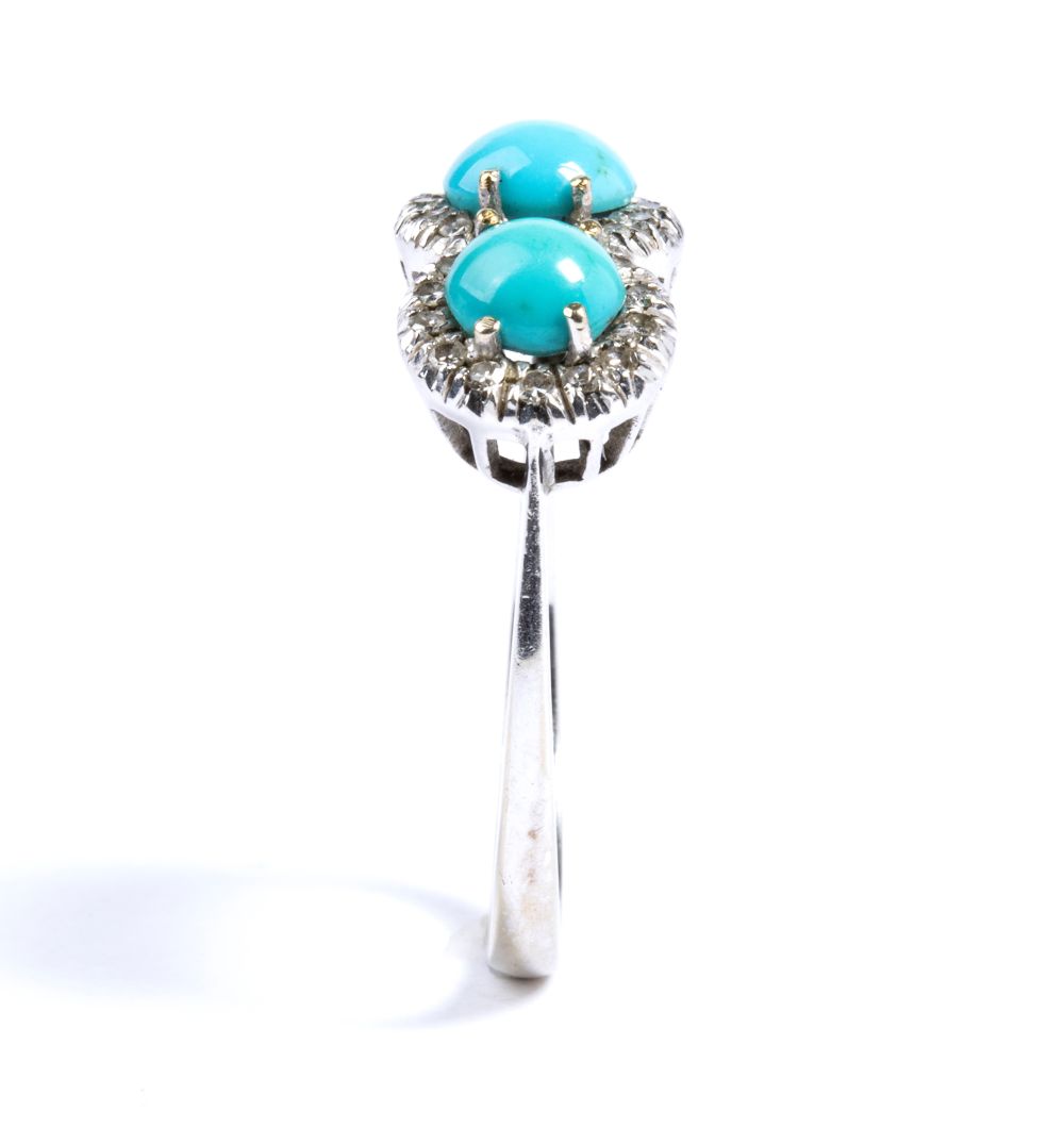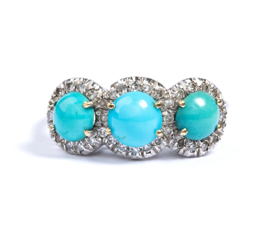 con linea di tre cabochon di turchese naturale contornati da diamanti taglio huit-huit.