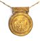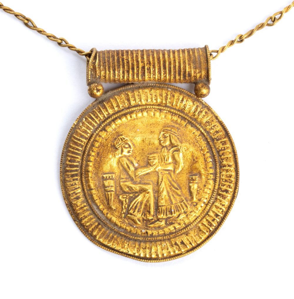 in oro giallo alto titolo, con catena a maglia ritorta che sospende un medaglione a lastra lavorata a sbalzo e cesello con raffigurazione di ispirazione classica.