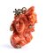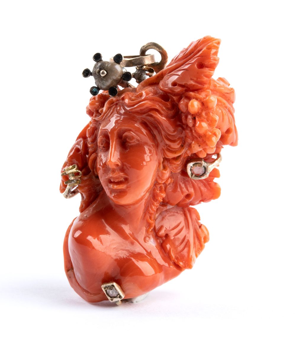 in oro a basso titolo, impreziosito da n. 02 diamanti taglio huit-huit e taglio a rosa, con al centro un corallo Cerasuolo (Coralliun Eliatus) raggihurante una figura a mezzo busto colta a tre quarti, con la bocca semichiusa e gli occhi persi verso l'alto e con l'acconciatura adornata di grappoli d'uva e viti.
