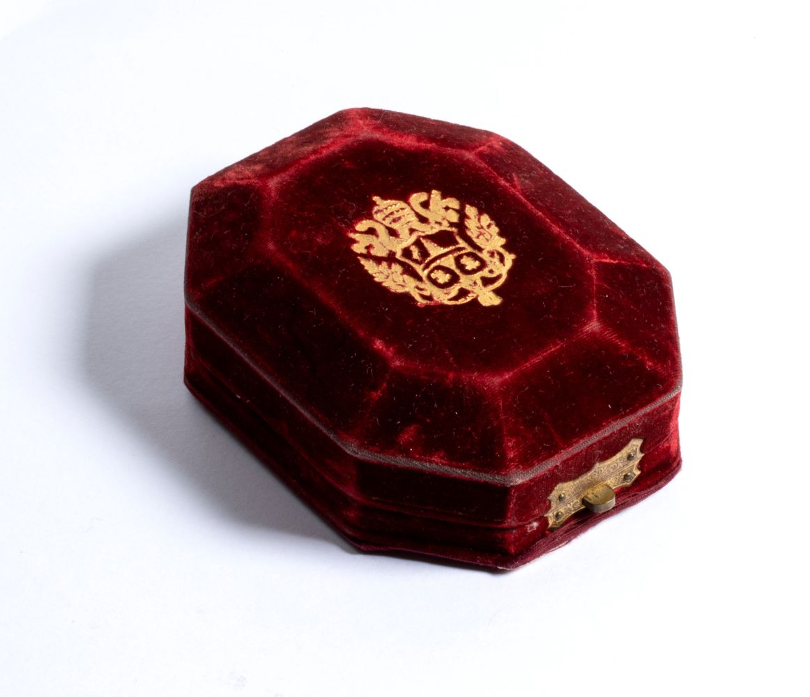 Con scatola in velluto rosso riportante lo stemma papale con chiavi incrociate e tiara papale.