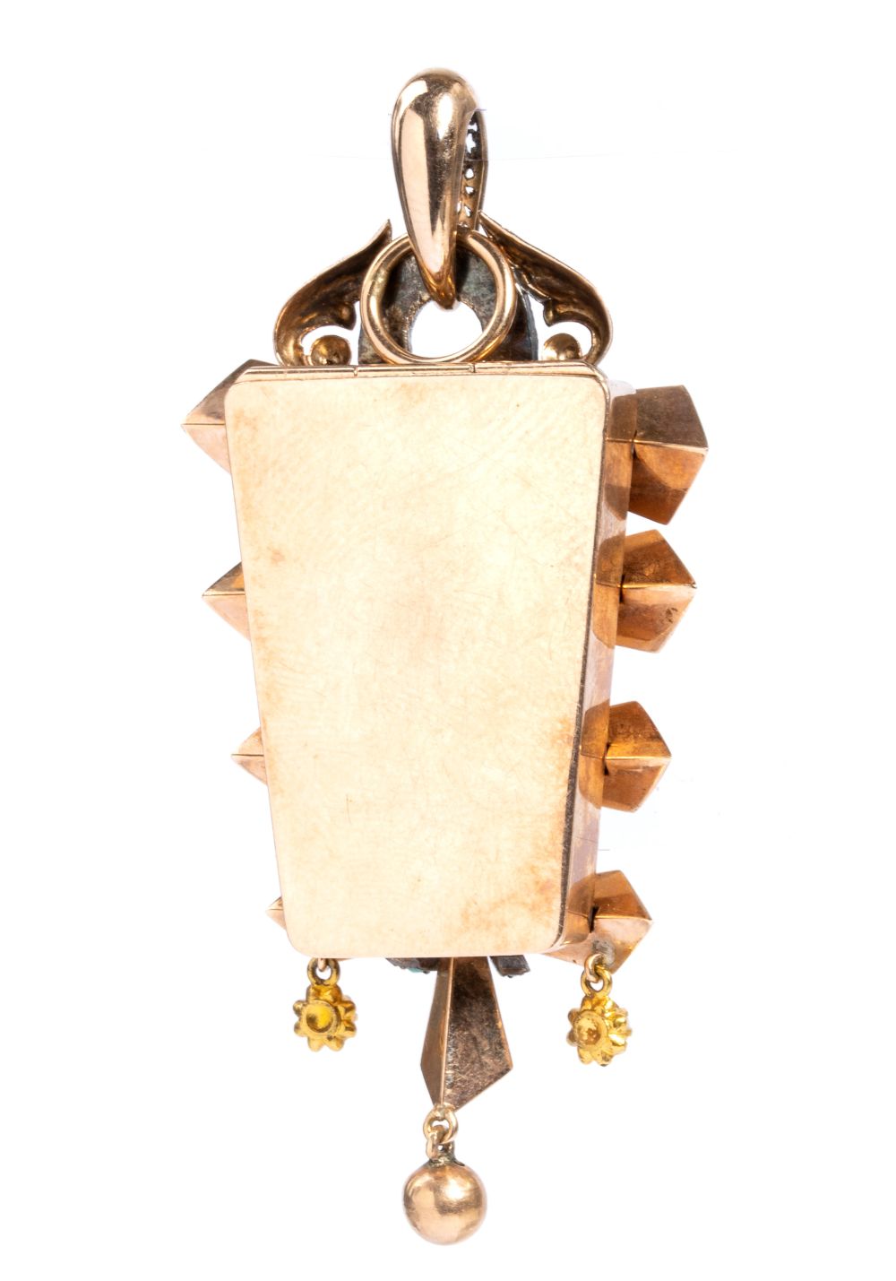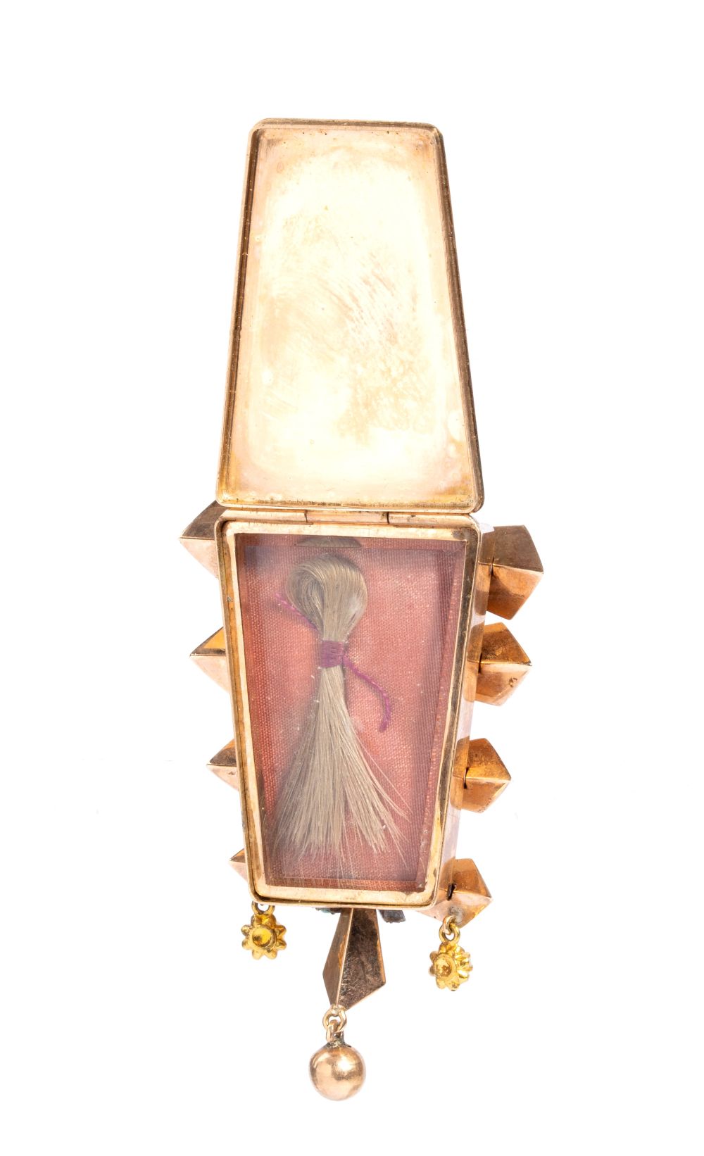 in oro a basso titolo, decorato con elementi geometrici sul fronte, impreziosito da piccole turchesi e piccole perle di fiume inserite in castoni a motivi floreali, piccoli dettagli lavorati a traforo. Il retro è apribile, al suo interno e' conservata una ciocca di capelli, elemento tipico di questa tipologia di gioielli ampiamente utilizzati in epoca Vittoriana, conosciuti come gioiello da lutto.