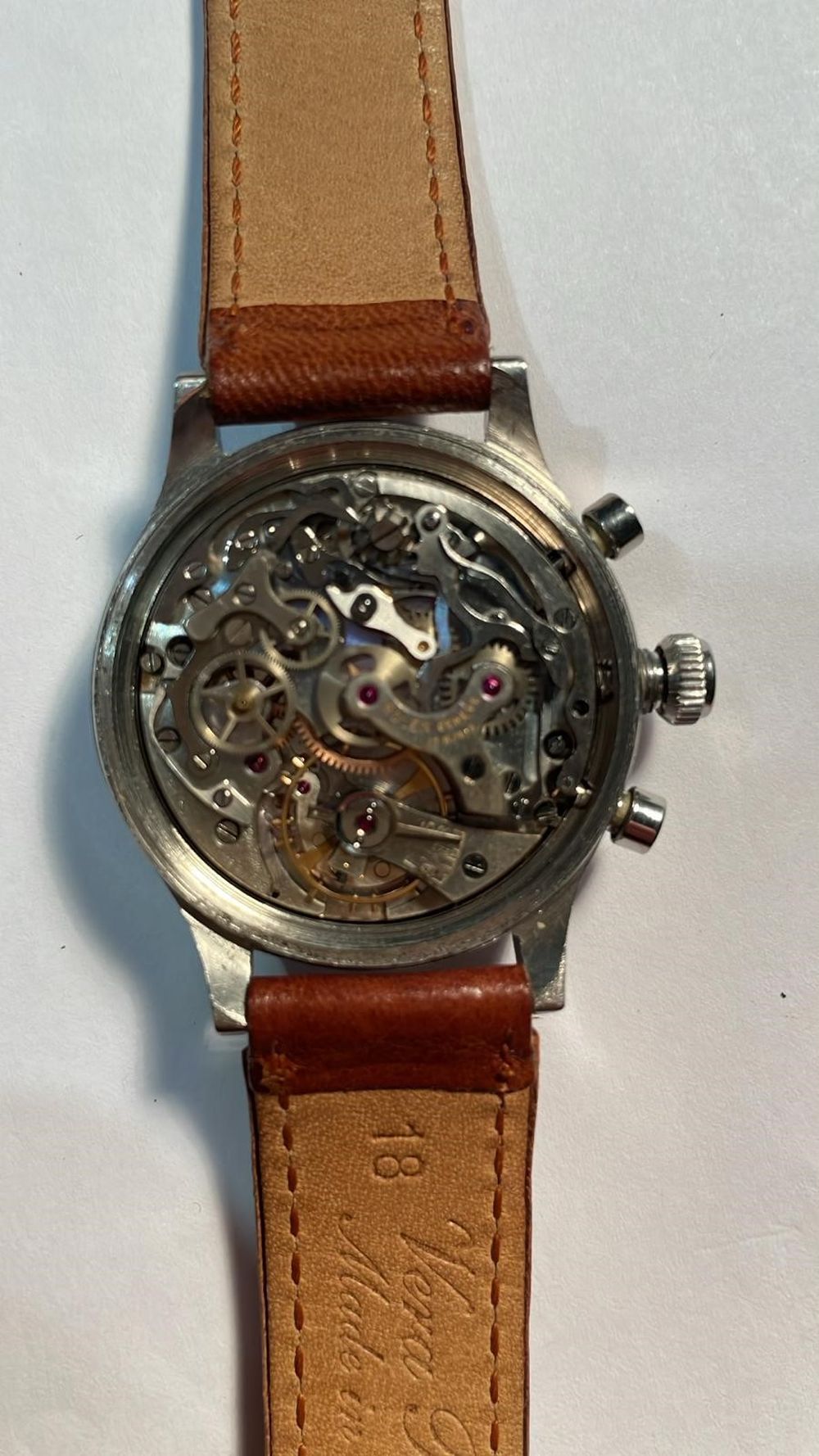 cassa in acciaio con pulsanti a pompa e fondello a vite, movimento cronografico a carica manuale base Valejoux 23.