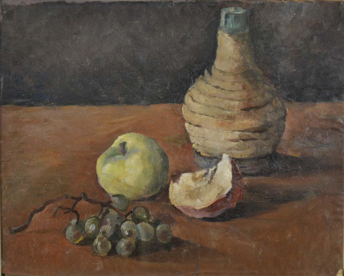 DE GRADA RAFFAELE Milano 1885 - 1957 Natura morta con fiaschetto 1954 olio su cartone 33x40 Esposizioni: IX Nazionale d'Arte figurativa Imola 1967 - etichetta al retro l'opera fu consegnata dalla vedova e dal figlio del pittore Raffaele De Grada in occasione della IX Nazionale d'Arte figurativa Imola 1967 come da documentazione allegata