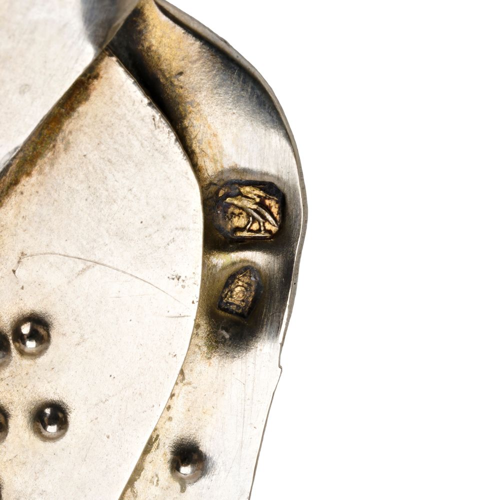 Argento 833/1000, punzonato con il marchio per l'argento al secondo titolo di 833/1000 in uso nella città di Porto, Portogallo, dopo il 1938; argentiere Luiz Ferreira.