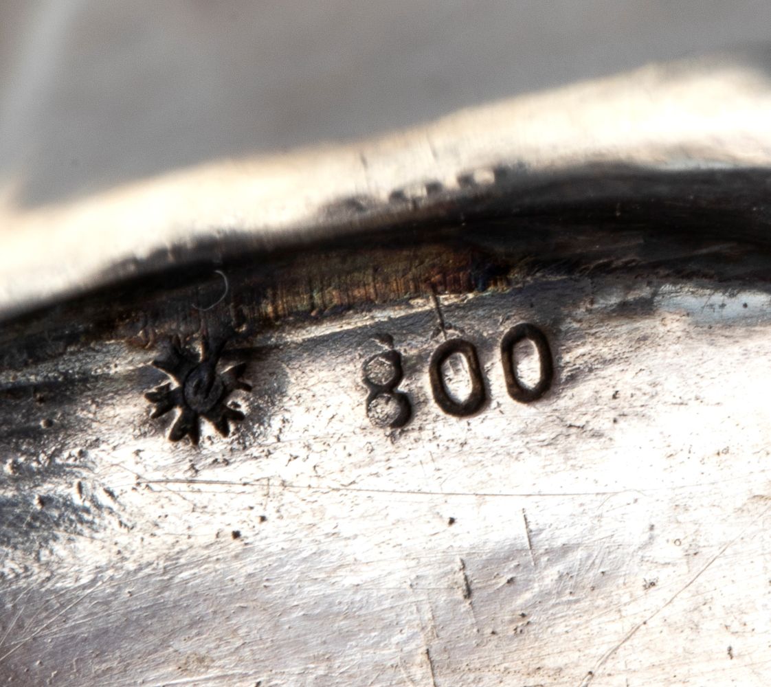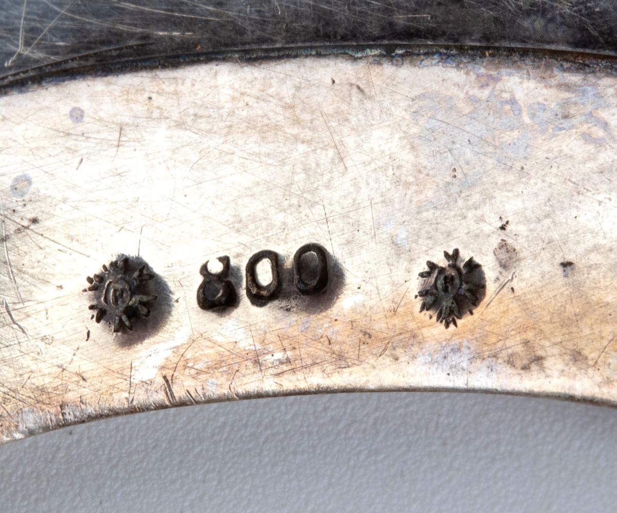 Argento 800/1000, punzonati "800 - 413 ROMA" e con marchio speciale per gli articoli in magazzino, utilizzato entro un anno dall'acquisizione dei nuovi punzoni.