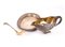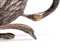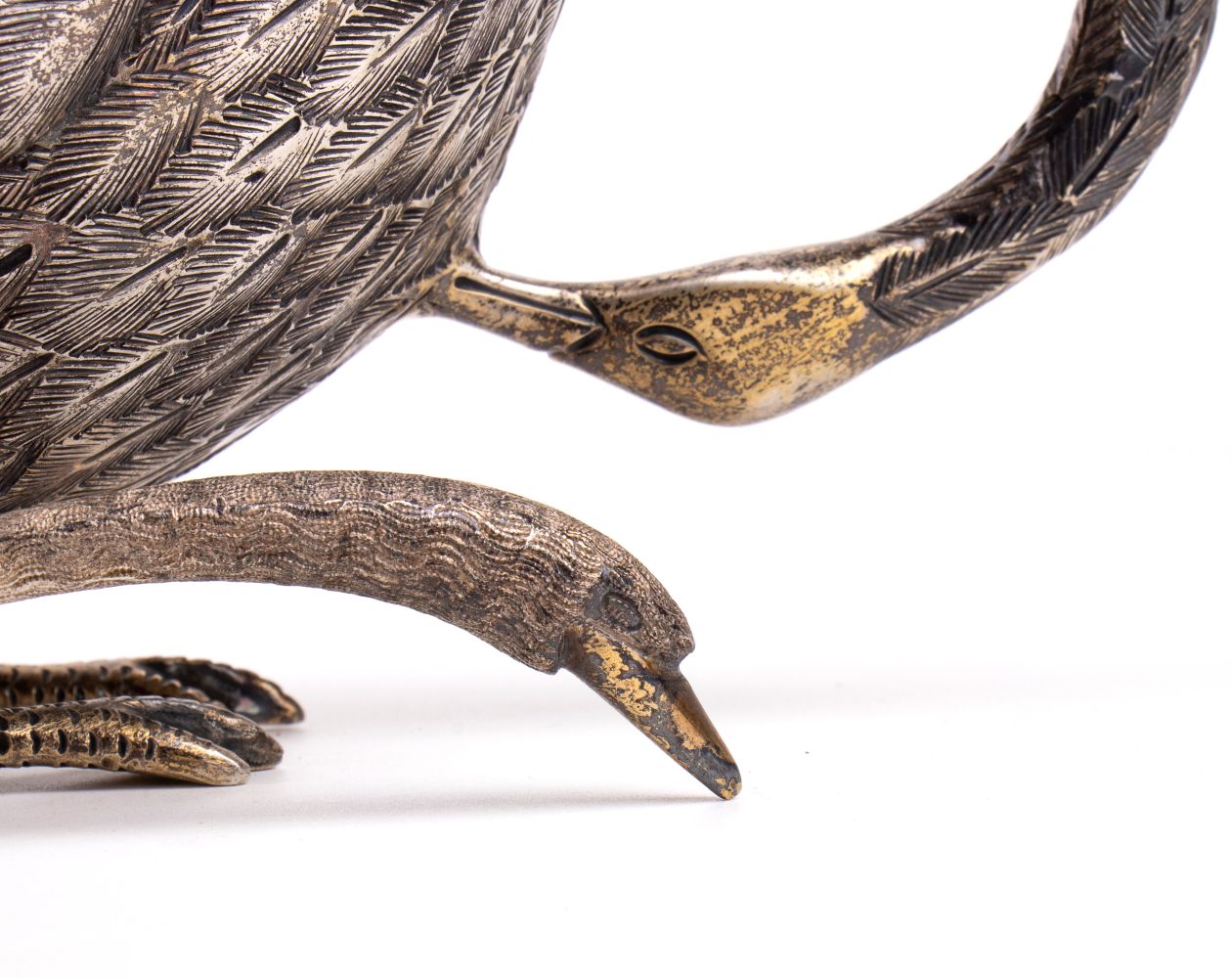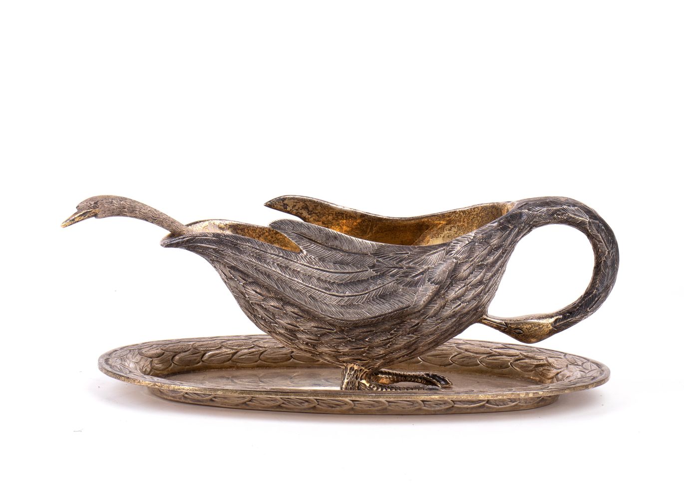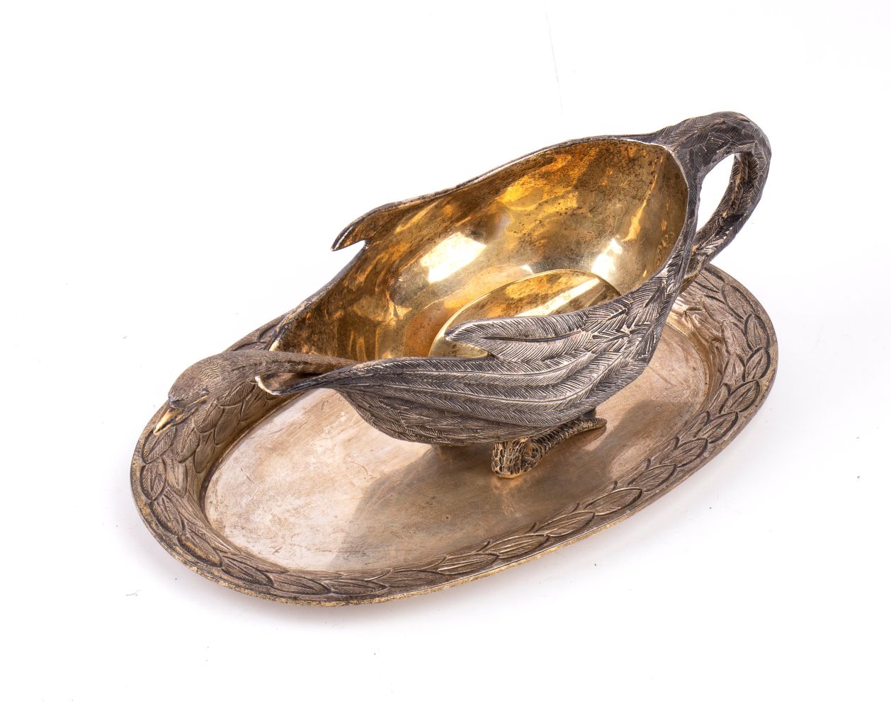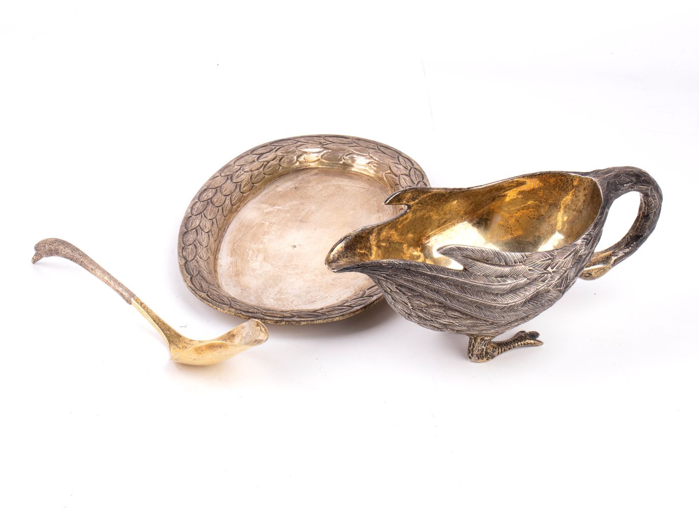 comprendente una coppa a forma di cigno, un cucchiaio con manico a forma di testa di cigno e un vassoio di forma ovale decorato con piume sui bordi.