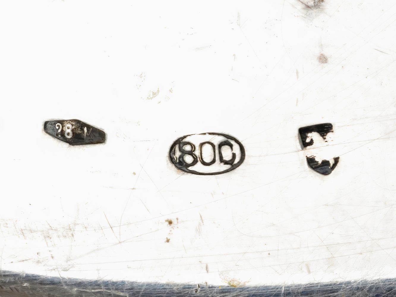 Argento 800/1000, punzonata "800 - 28 M", argentiere S. AN. FABBRICA ITALIANA ARGENTERIE di Alignani Pasquale & Alignani Mariano.