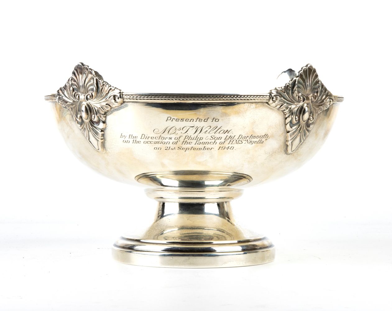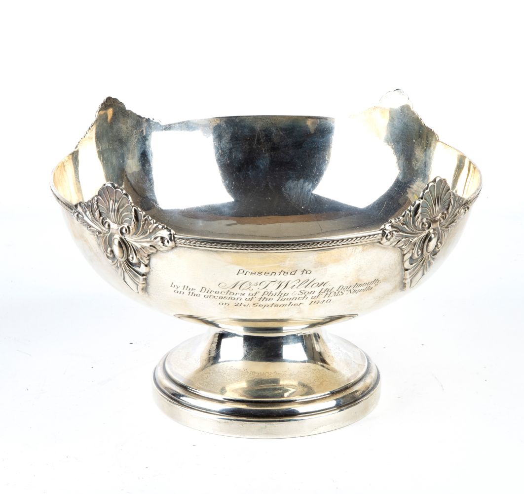 Altezza x larghezza x lunghezza: 17 x 26 x 26 cm. Peso: 905 gr circa. di forma circolare, decorata con quattro dettagli raffiguranti conchiglie e foglie, dal fusto liscio, poggiante su una base circolare. Riporta su di un lato la seguente dicitura: "Presented to Mrs. T. Wilton. by the Directors of Philip & Son Ltd. Darmouth, on the occasion of the launch of H.M.S "Nigella" on 21st September 1940.