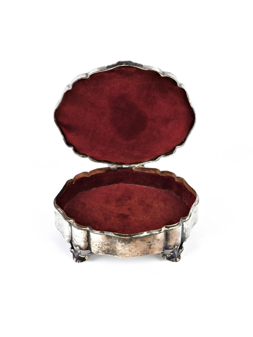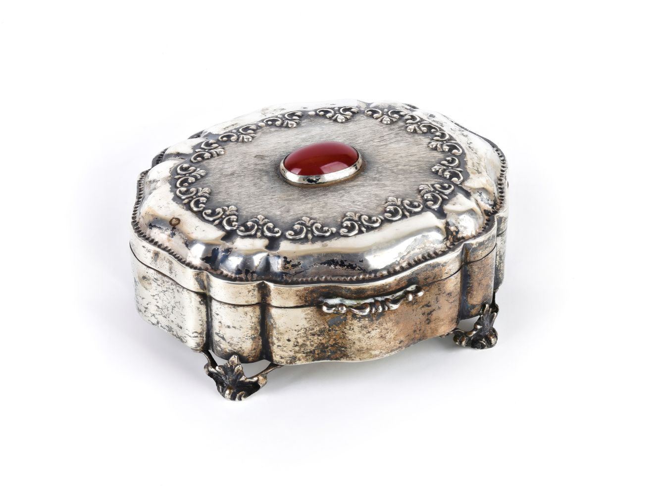 di forma ovale, finemente decorata con motivi vegetali e poggiante su 4 piedini floreali; il coperchio incastonato con un cabohon di corniola.