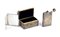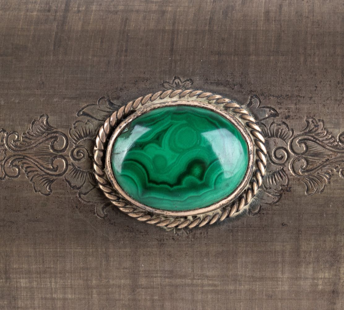composta da un portabiglietti di forma rettangolare, decorato a motivi floreali; una bottiglia porta liquori e una scatola di forma rettangolare, satinata e decorato con fiori, con cabochon di malachite sul coperchio, interni in tessuto blu, dotata di chiave di apertura.
