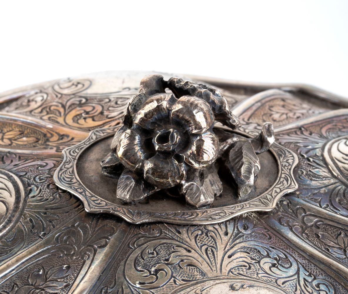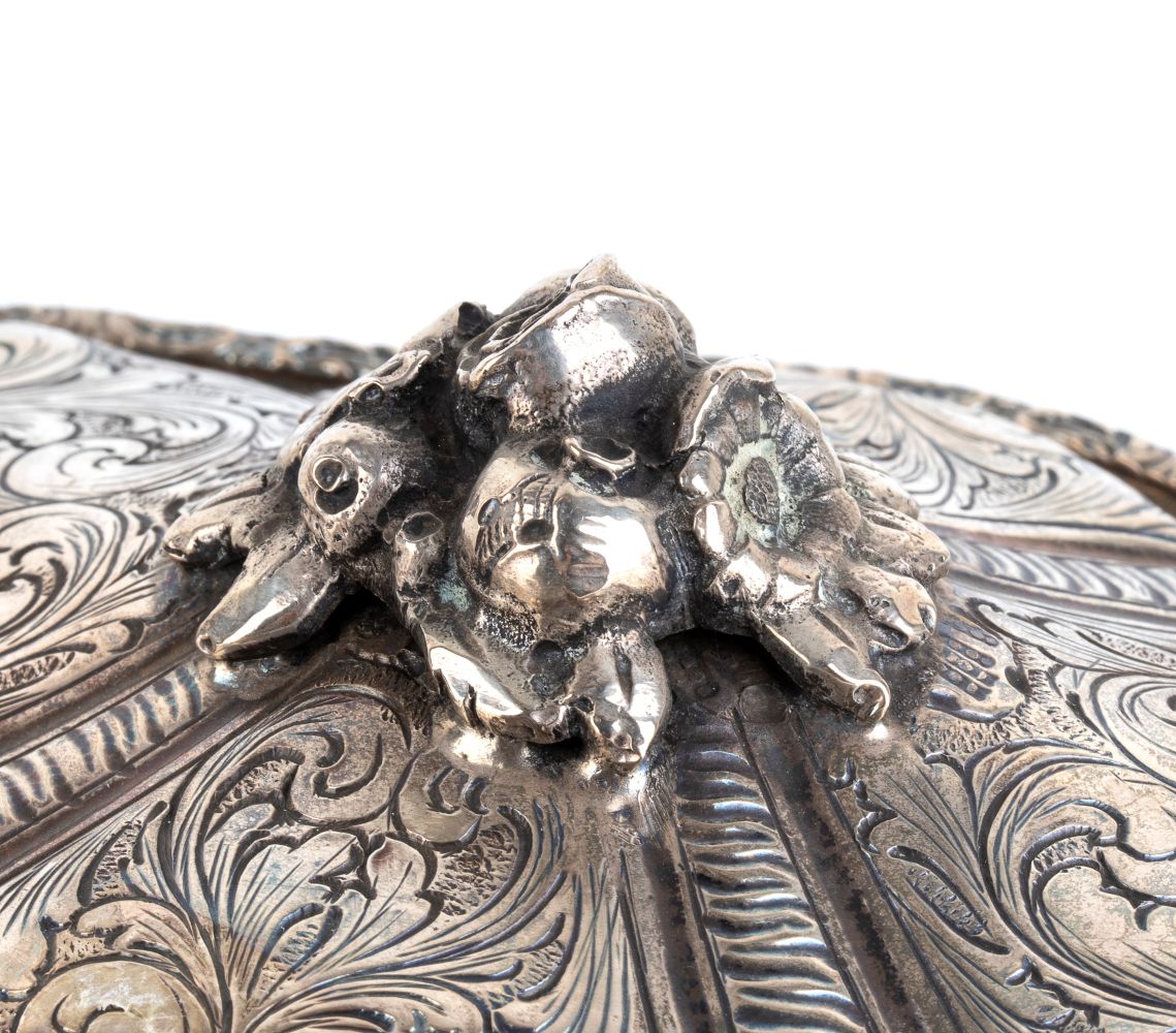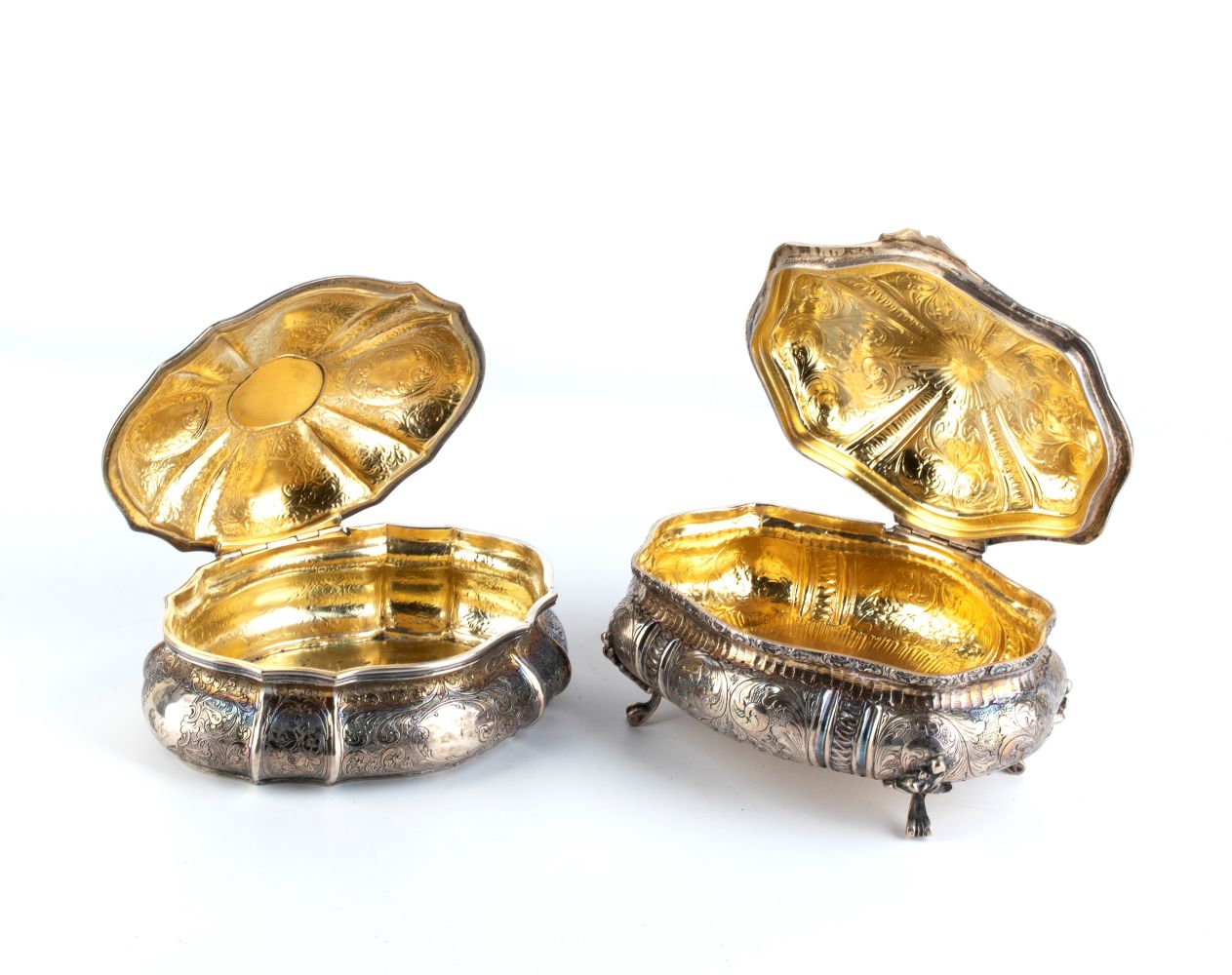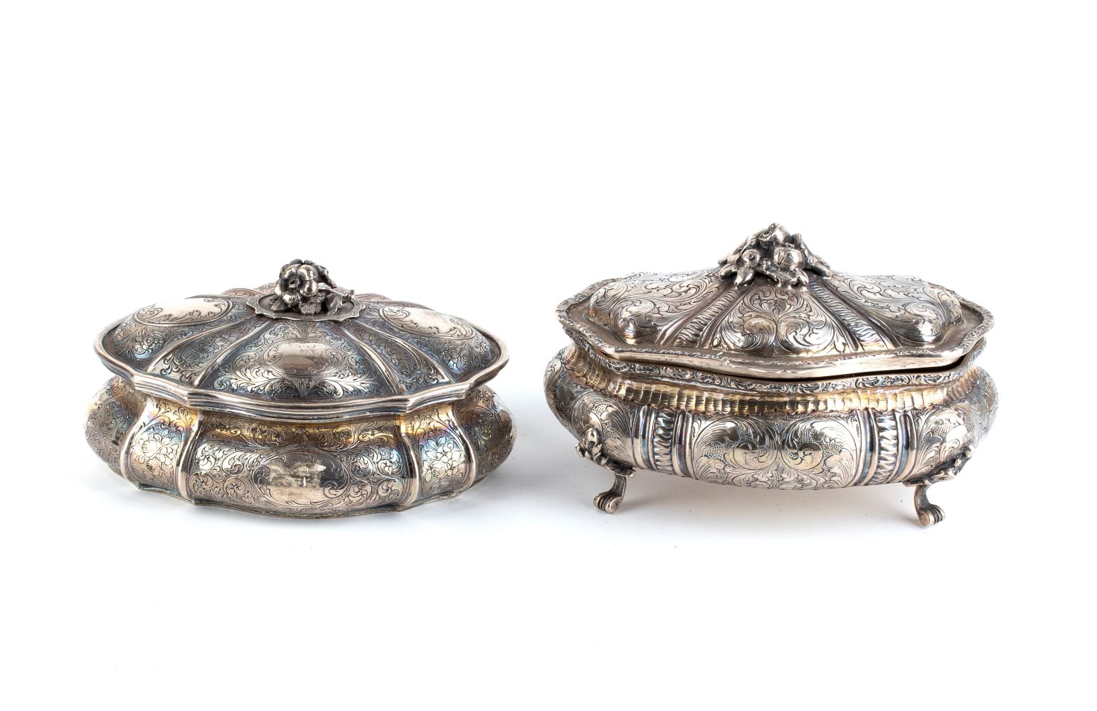 di forma polilobata con decorazioni incise floreali e coperchio con presa floreale. Una delle scatole presenta quattro piedini da appoggio a foglia.
