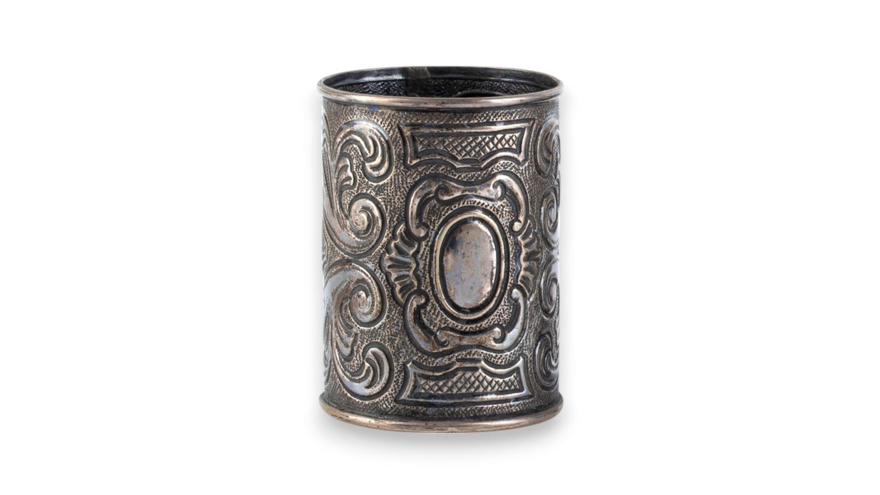 di forma cilindrica, lavorato con decorazioni a motivi vegetali.