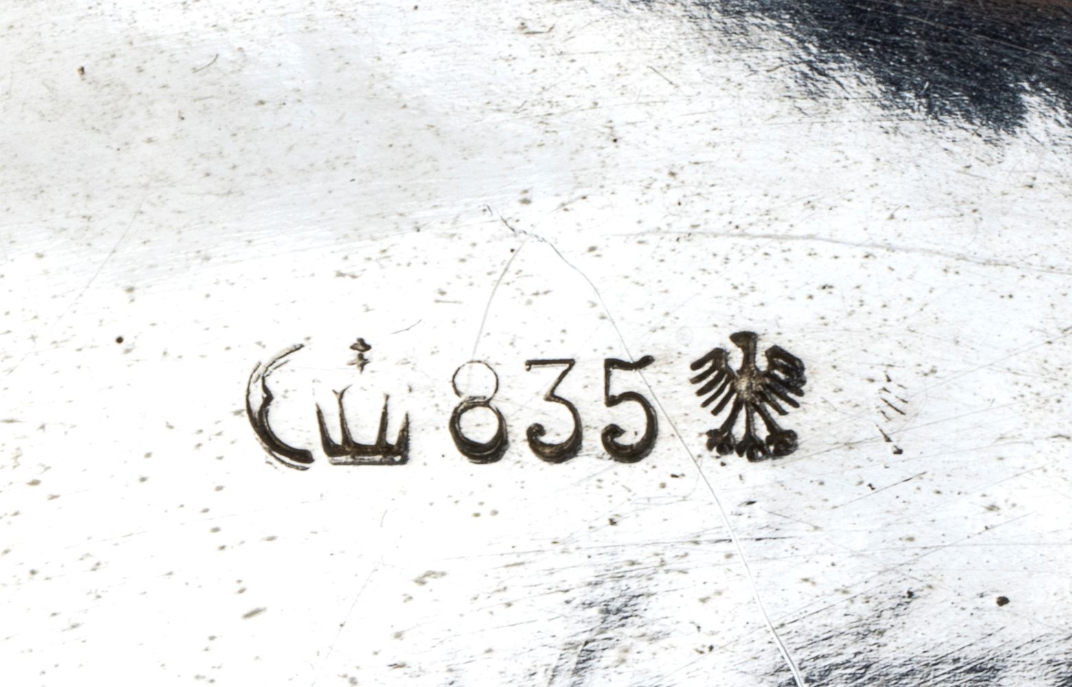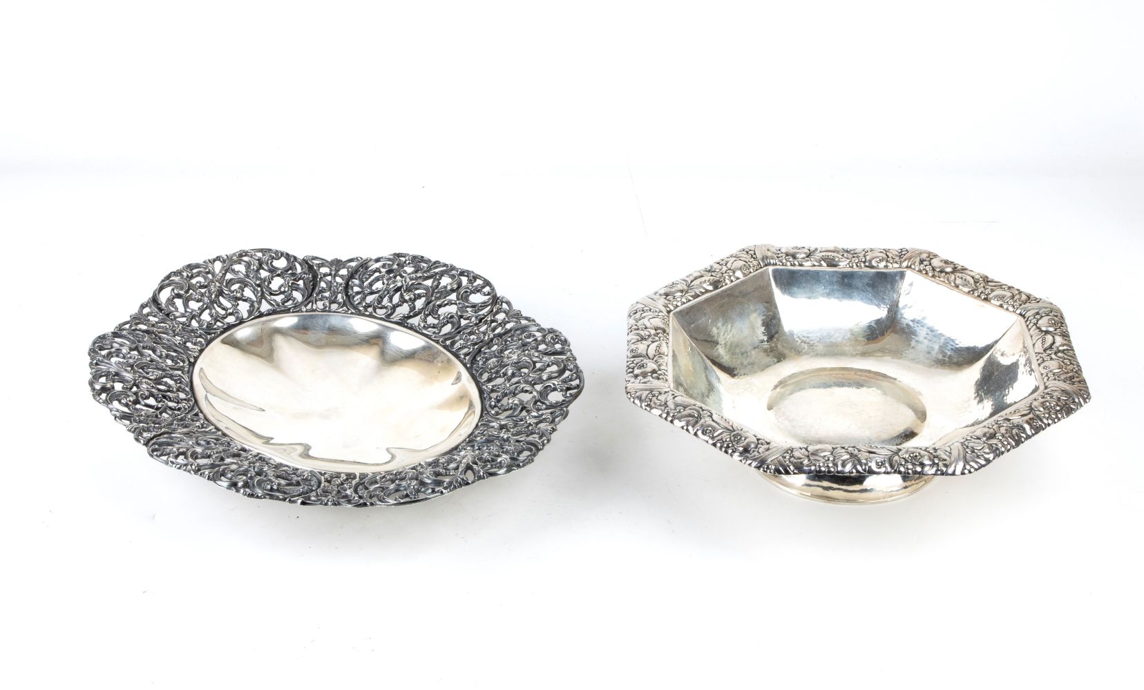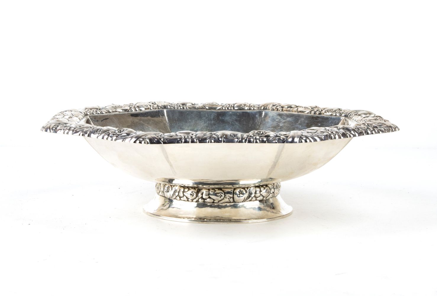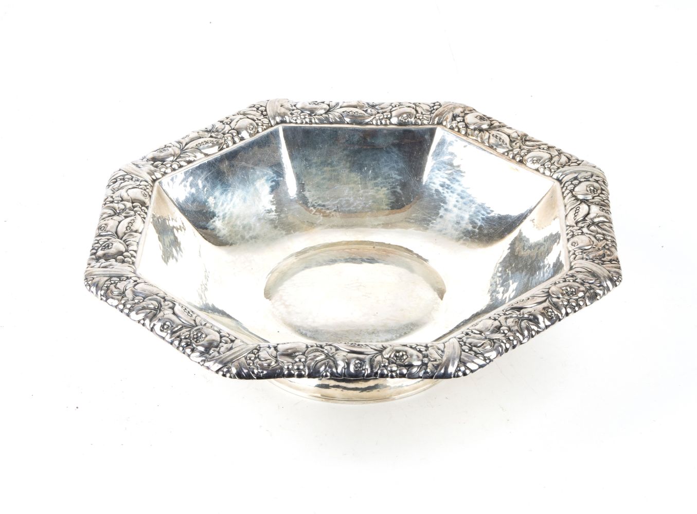 Cestin ottagonale, argento 835/1000, punzonato con i marchi tedeschi in uso a partire dal 1888; dimensioni 7 x 26 x 26 cm.