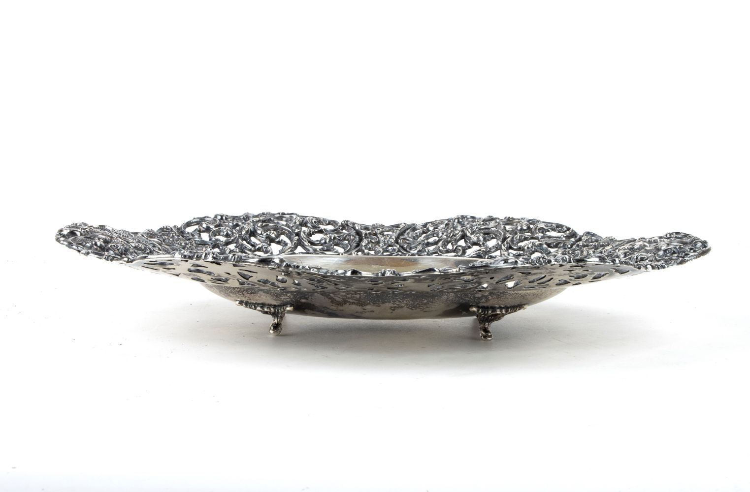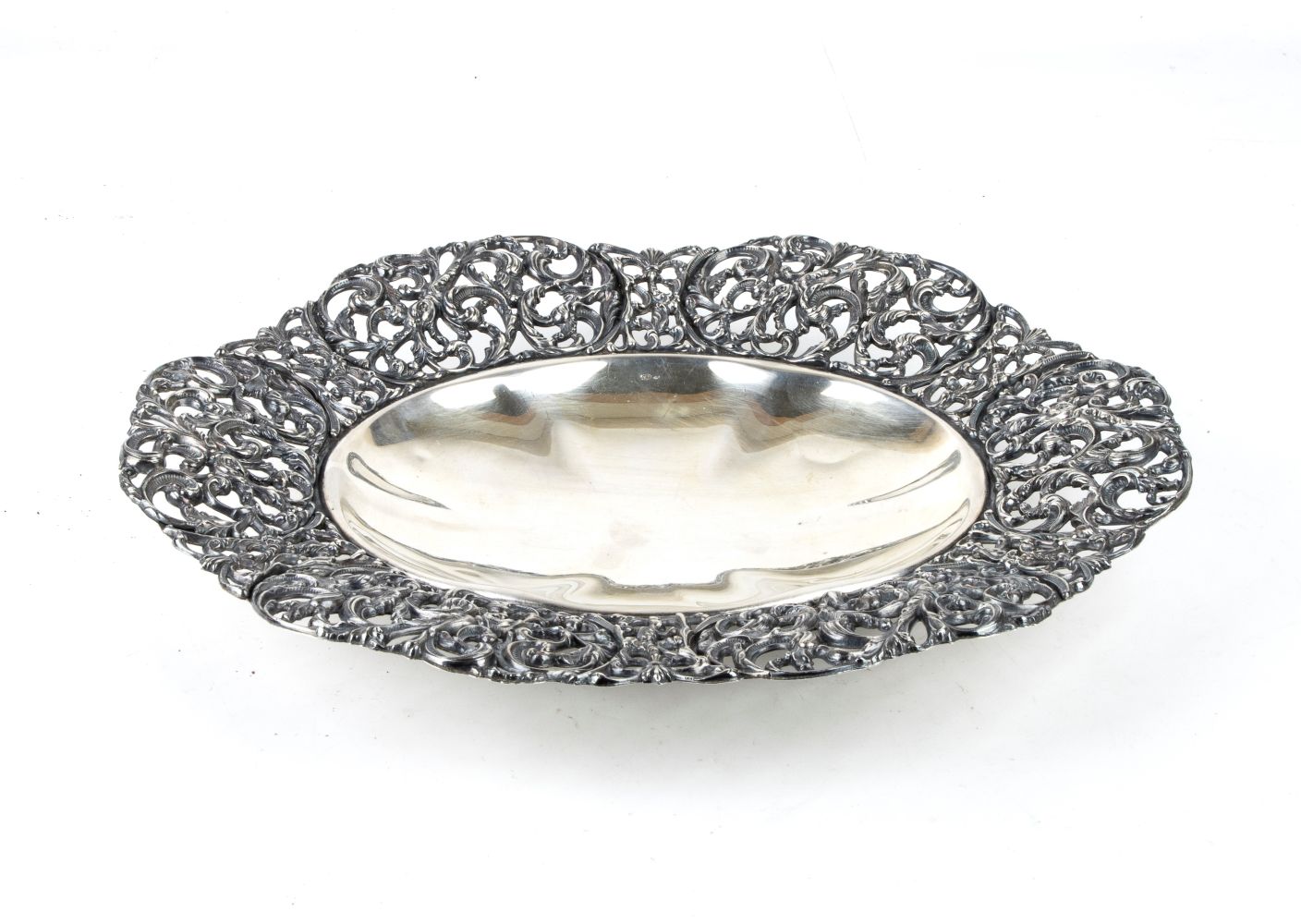 Cestino ovale, argento 800/1000, punzonato "800", dimensioni 5,5 x 32 x 27 cm;