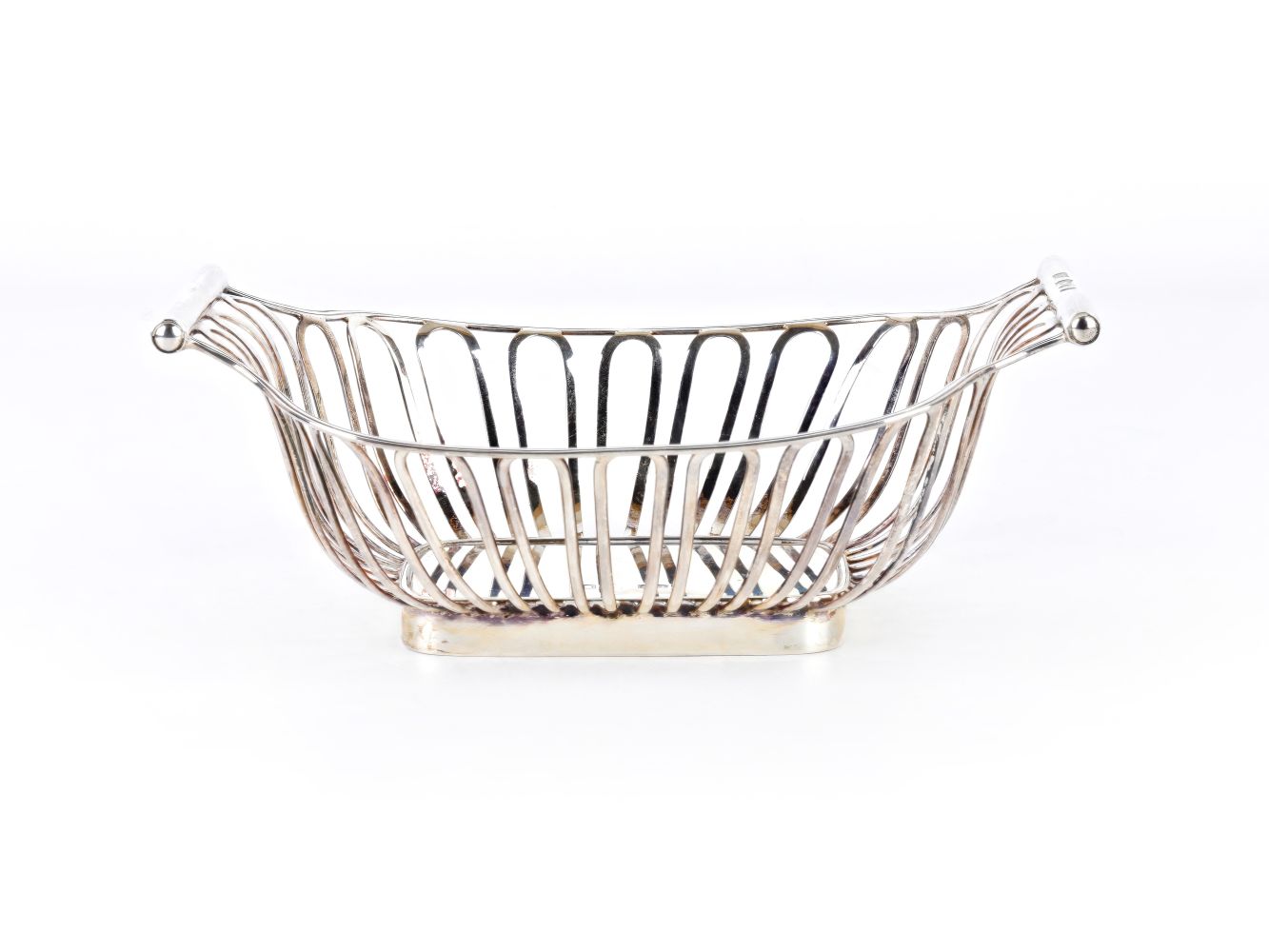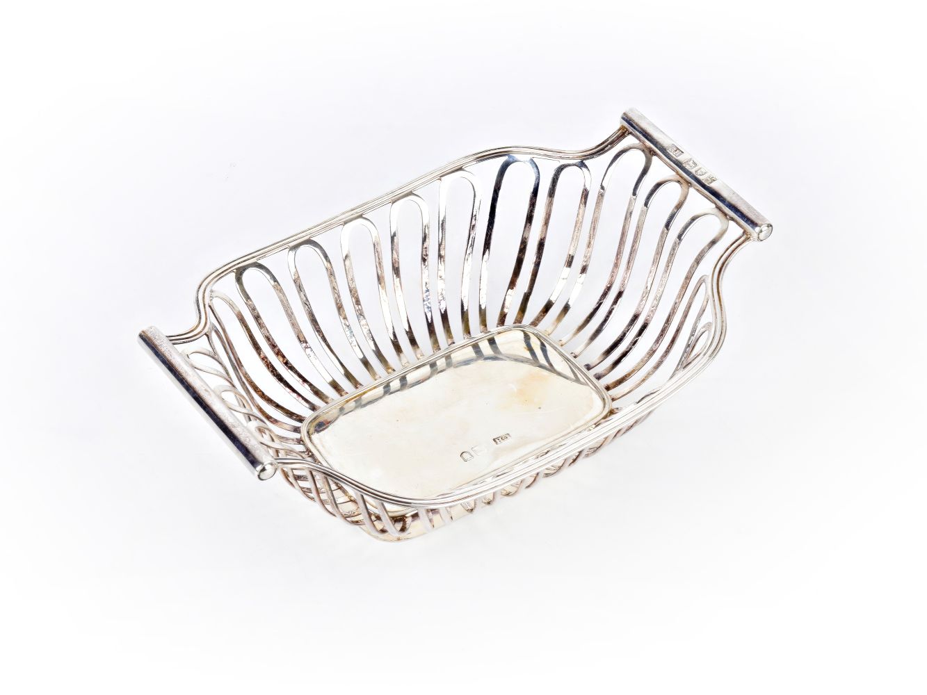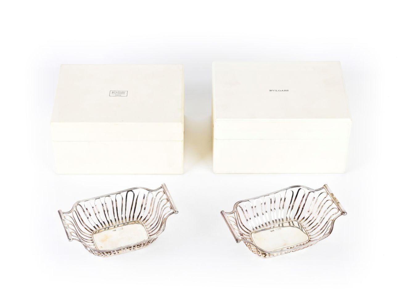 Coppia di cestini inglesi in argento Londra 1902 Altezza x larghezza x lunghezza: 4 x 14,5 x 10 cm. Peso complessivo dell'argento: 260 gr circa. Peso complessivo di scatole: 810 gr circa.