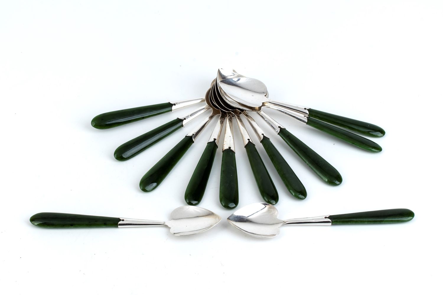 Lotto di 12 cucchiaini in argento e giadeite Lunghezza: 16 cm. Peso lordo complessivo: 365 gr.