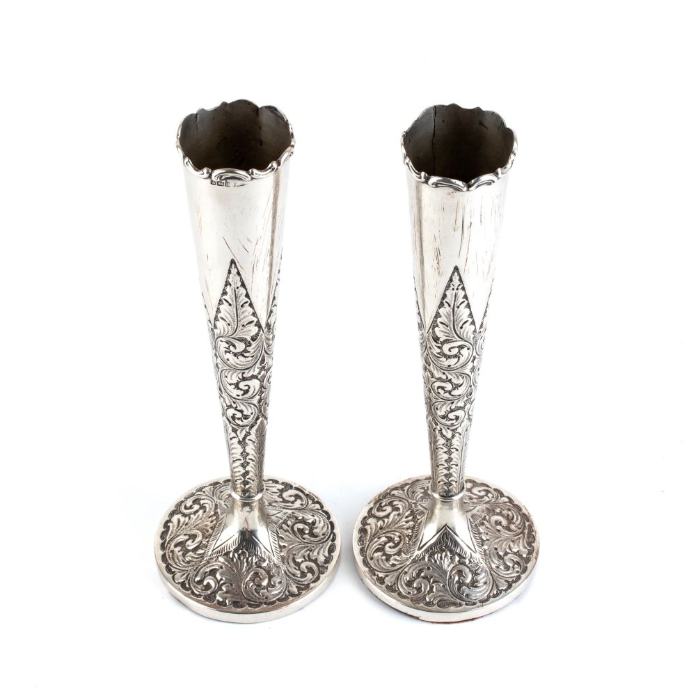 Lot 263 | WALKER & HALL Coppia di vasetti portafiori inglesi in argento Sheffield 1902 Altezza x larghezza x profondità: 25 x 8,5 x 8,5 cm. Peso: 240 gr circa.