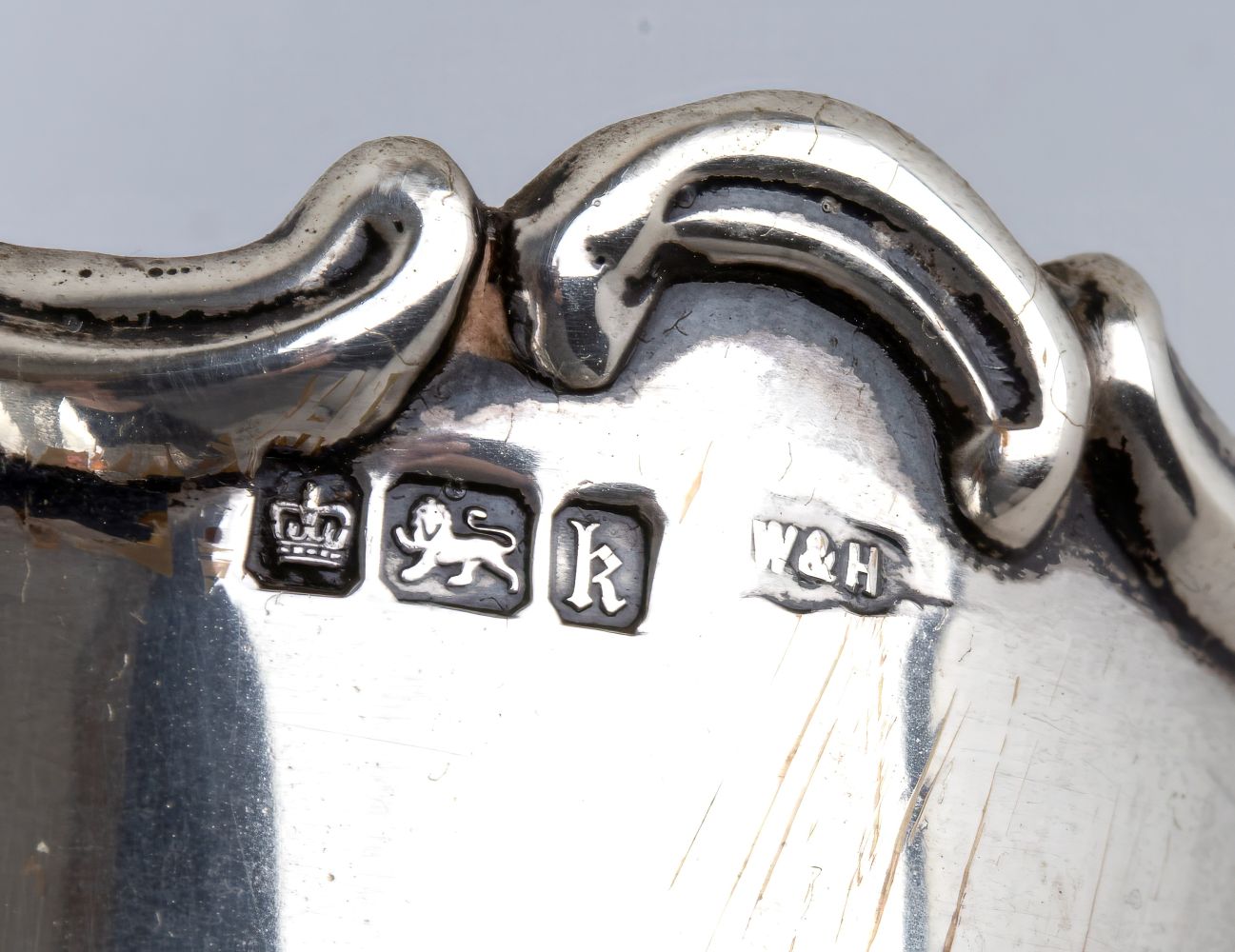 Argento 925/1000 con base appesantita, punzonati con la serie completa di marchi Sheffiled 1902-1903, argentiere Walker & Hall.