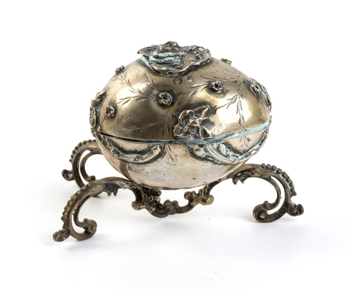 Lot 280 | Uovo in argento Manifattura Russa (?) del XX secolo Altezza x larghezza x profondità totali 8 x 10,5 x 6 cm. Peso 164 gr.
