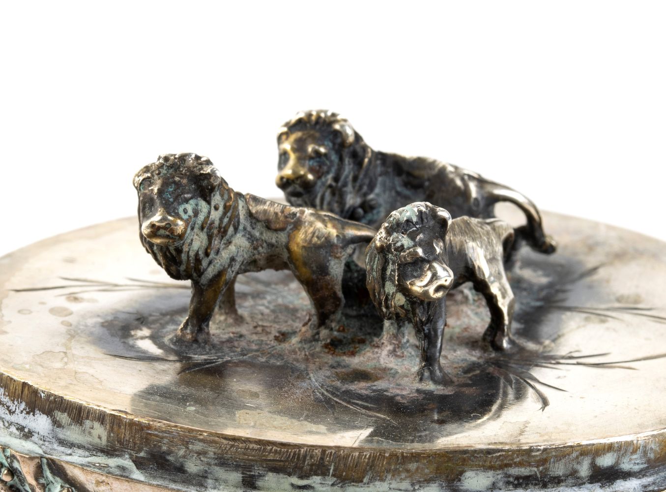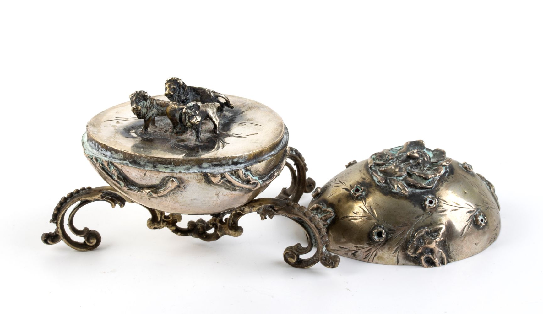 in argento fuso con coperchio ad innesto, decorato con festonii vegetali e una testa femminile, poggiante su un supporto a tripode con volute vegetali.