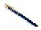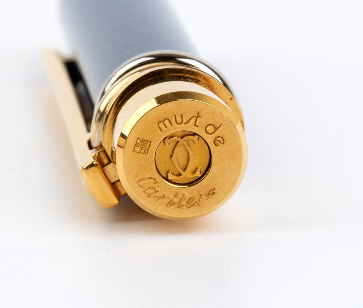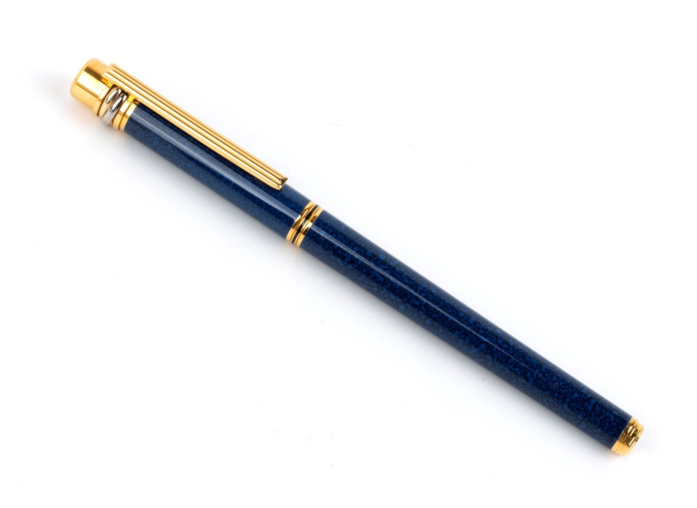 Corpo e cappuccio blu con clip e dettagli placcati in oro, pennino rodiato in oro 18k riportante la dicitura "18K - 750 - logo Cartier". Numero seriale B36969.