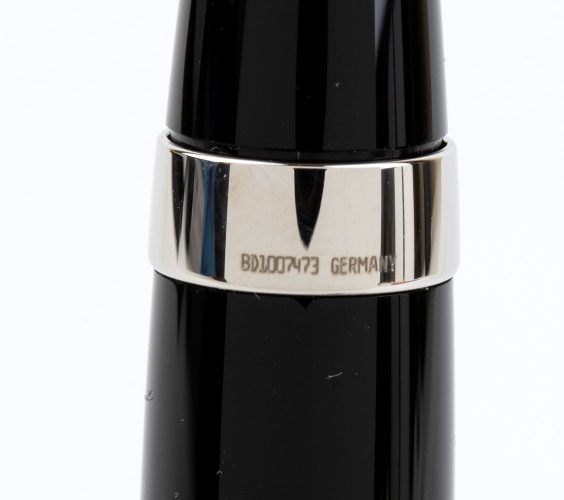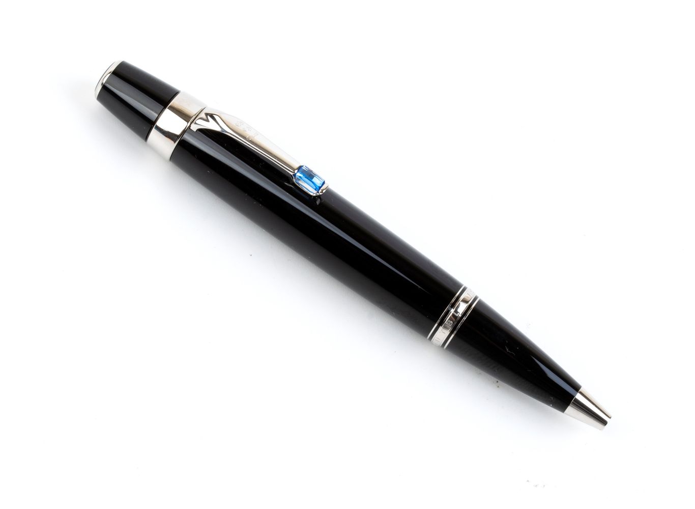 Corpo in pregiata resina nera con finiture in acciaio impreziosite da un topazio blu sulla clip, stella bianca Montblanc intarsiata. Scatola, controscatola e documenti Montblanc. Numero BD1007473 GERMANY.