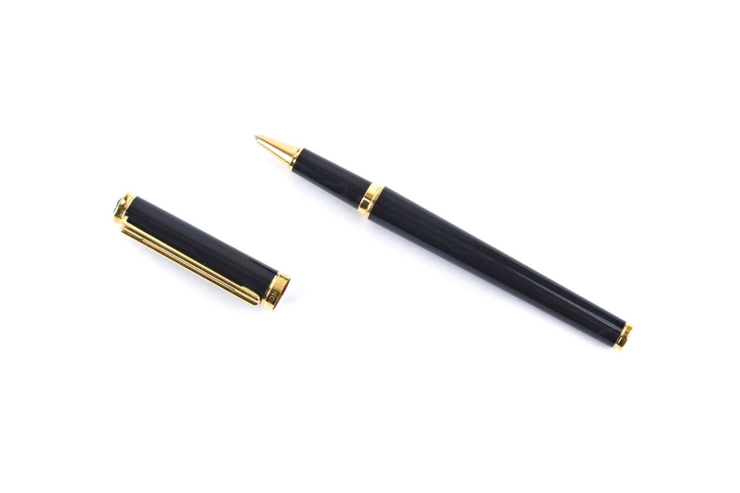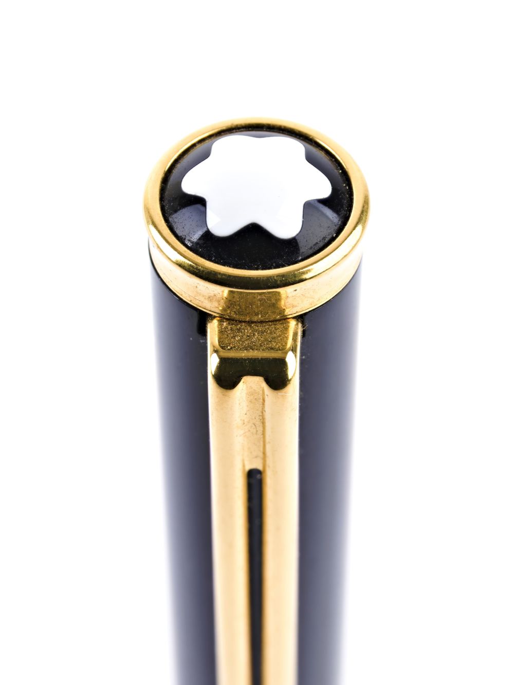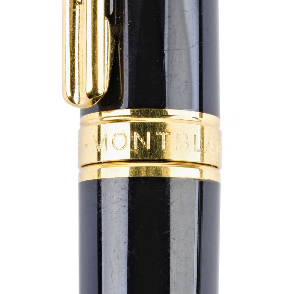 corpo in pregiata resina nera, stella bianca Montblanc intarsiata, finiture e clip dorate.