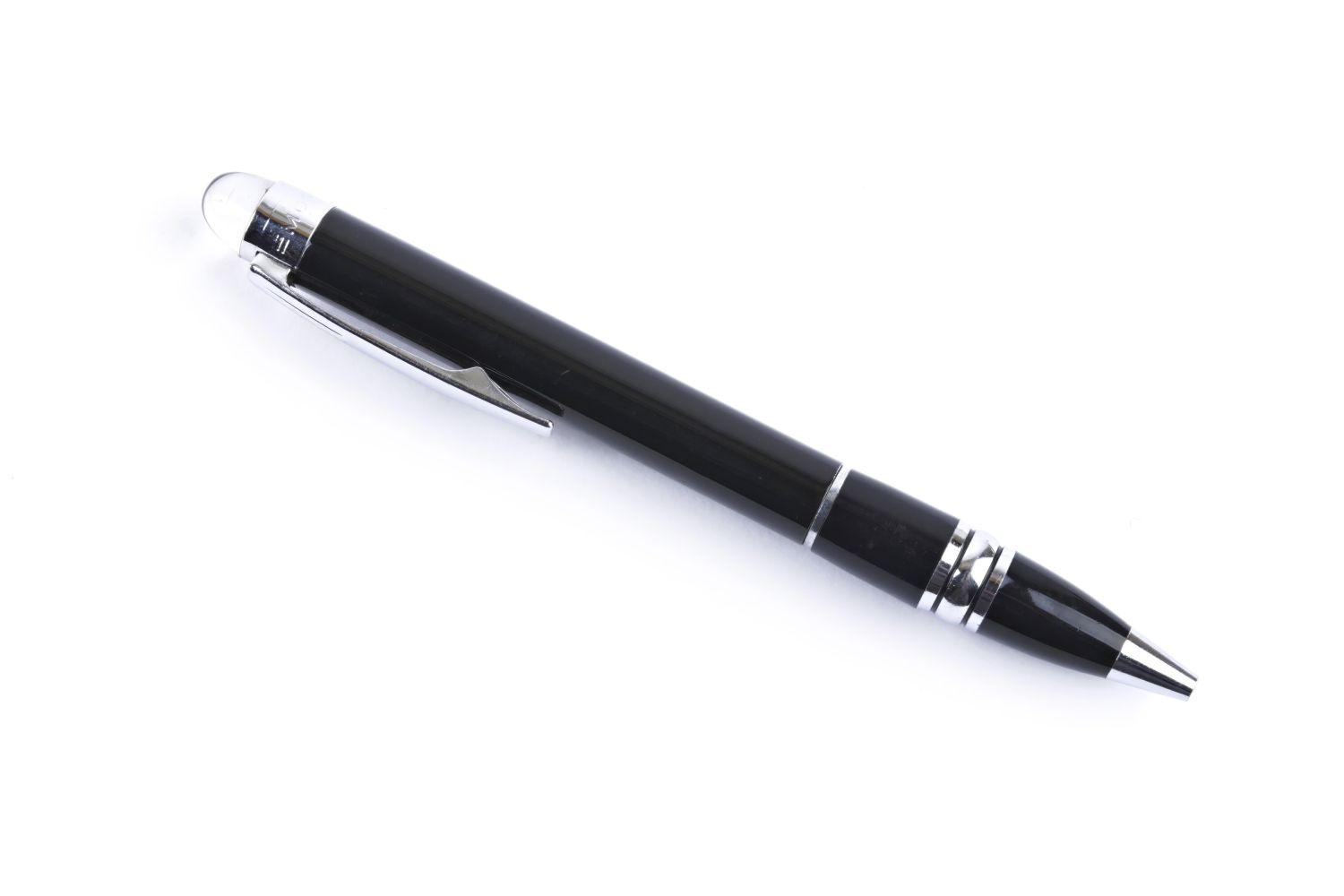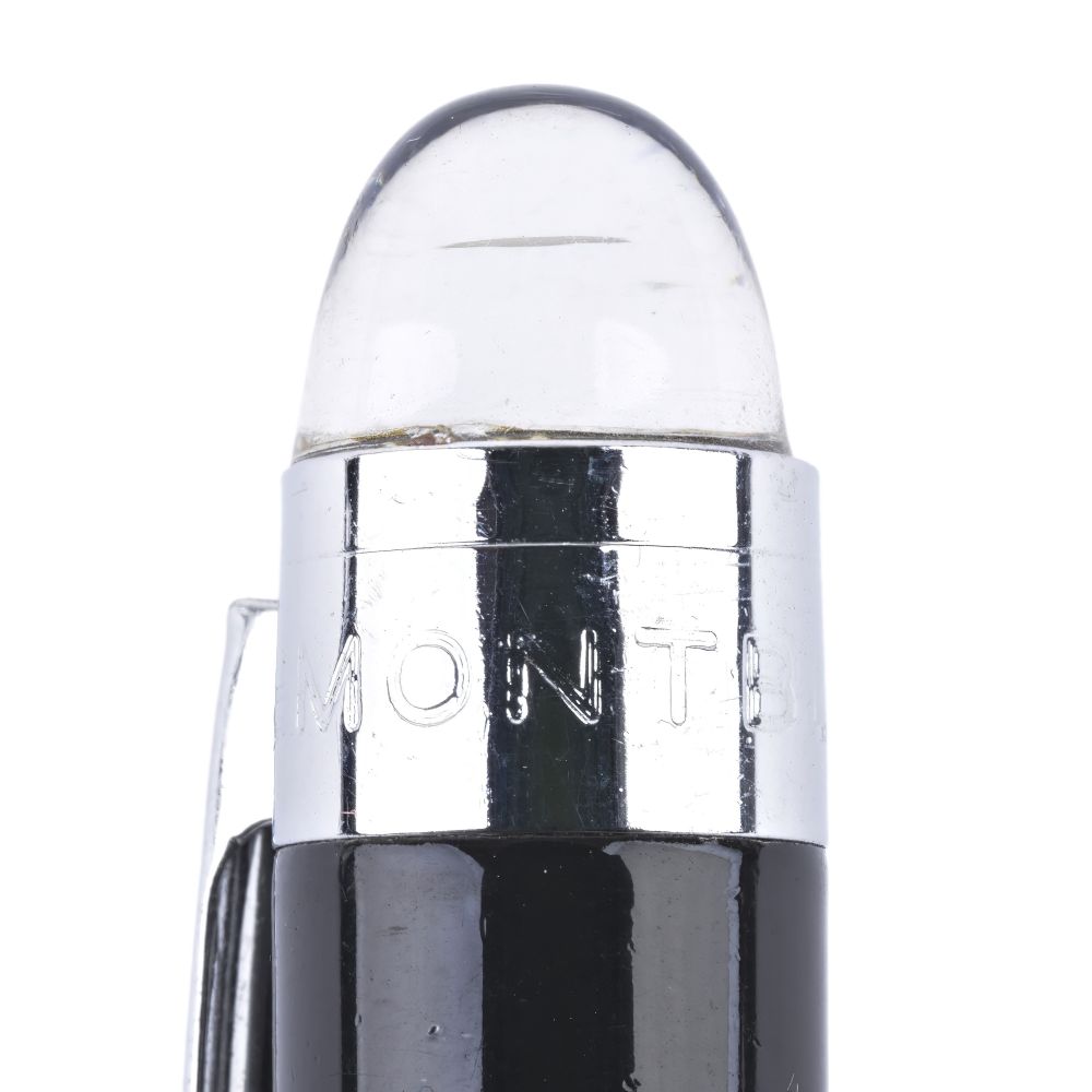 corpo in pregiata resina nera, stella bianca Montblanc fluttuante inserita in una cupola in resina trasparente, finiture e clip in acciaio cromato.