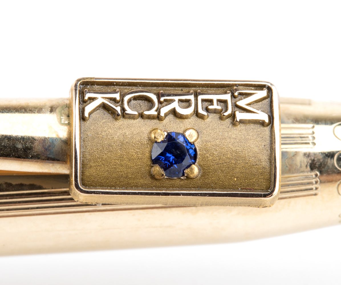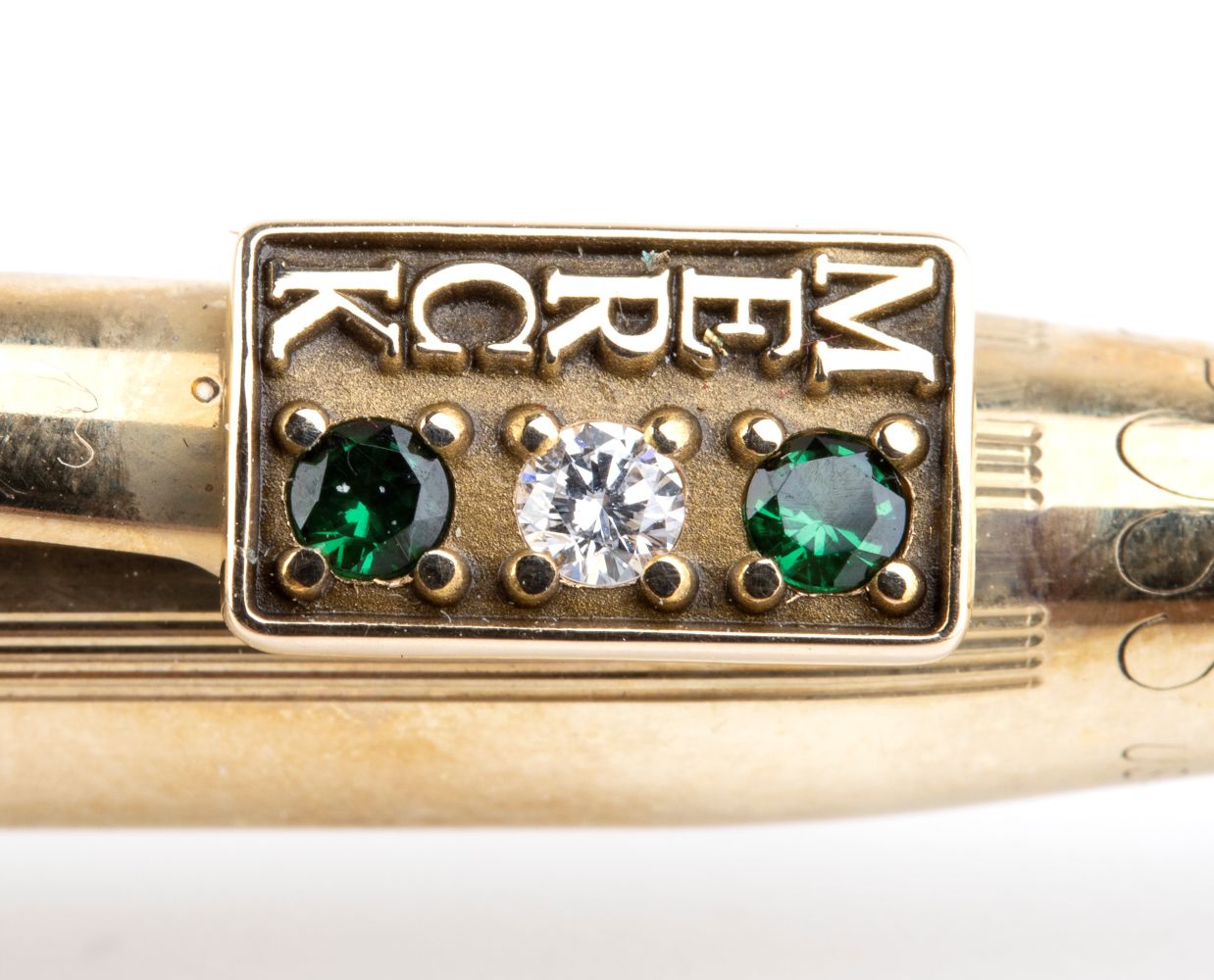 meccanismo a rotazione, corpo in metallo dorato, clips personalizzate dall'aziena "Merk" con brillanti e pietre di colore.
