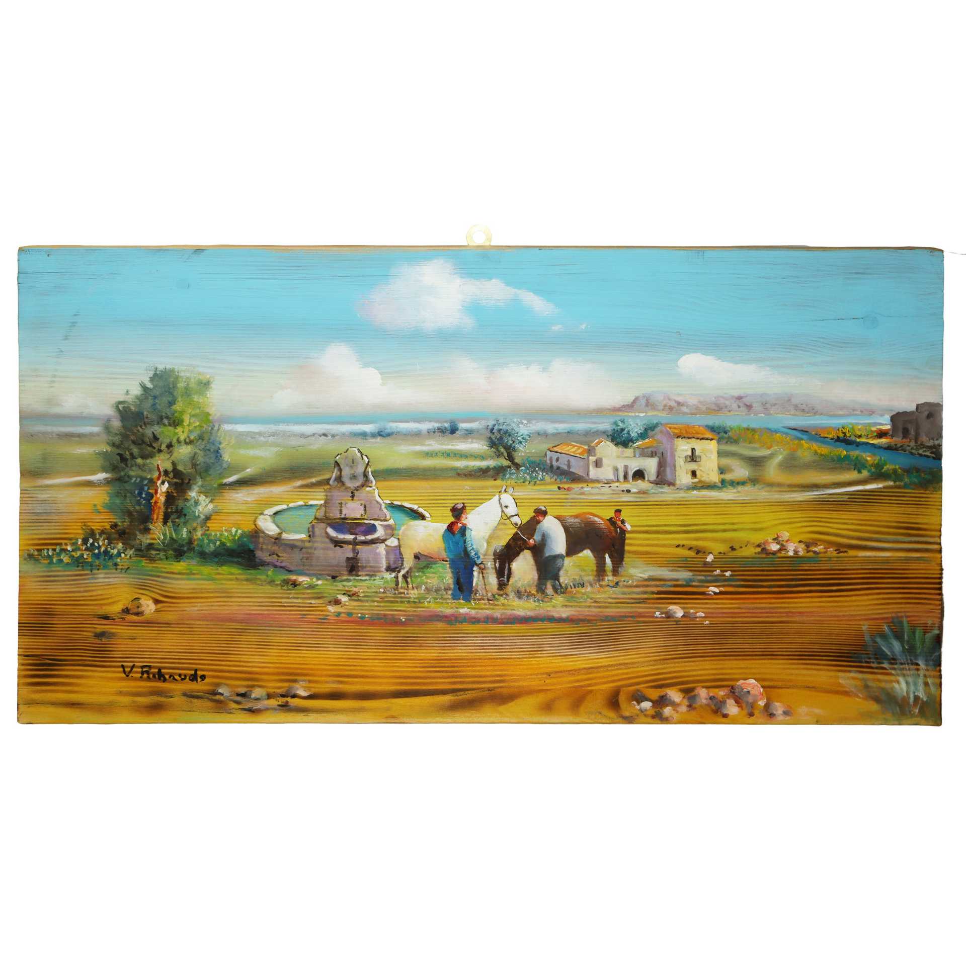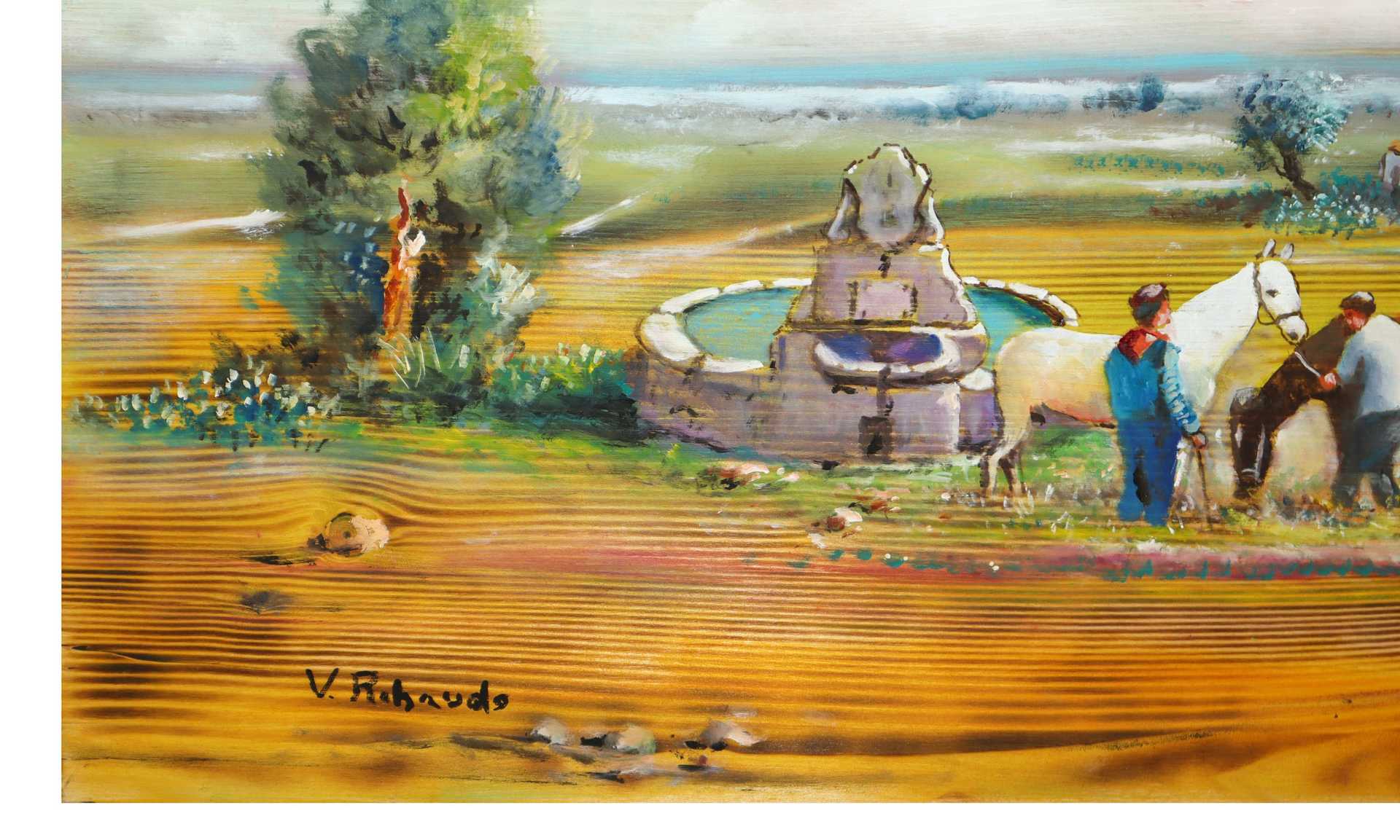 Vittorio Ribaudo (Palermo 1937-2022) - Scena agreste all'abbeveratoio h cm 40 x 75 olio su legno di abete Vittorio Ribaudo originario di Palermo è diventato famoso poichè realizzava le sue opere non solo su tela ma anche su legno, marmo e pietre preziose, materiali da lui usati per raffigurare le scene della divina commedia. Ha partecipato a parecchie mostre sia in Italia che all'estero.