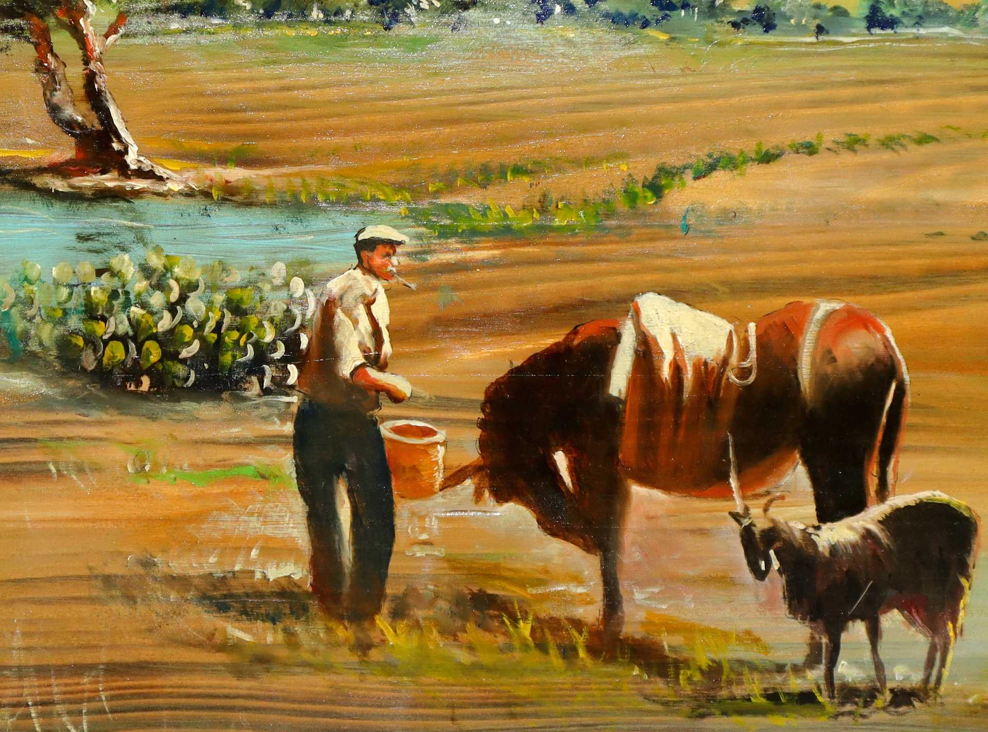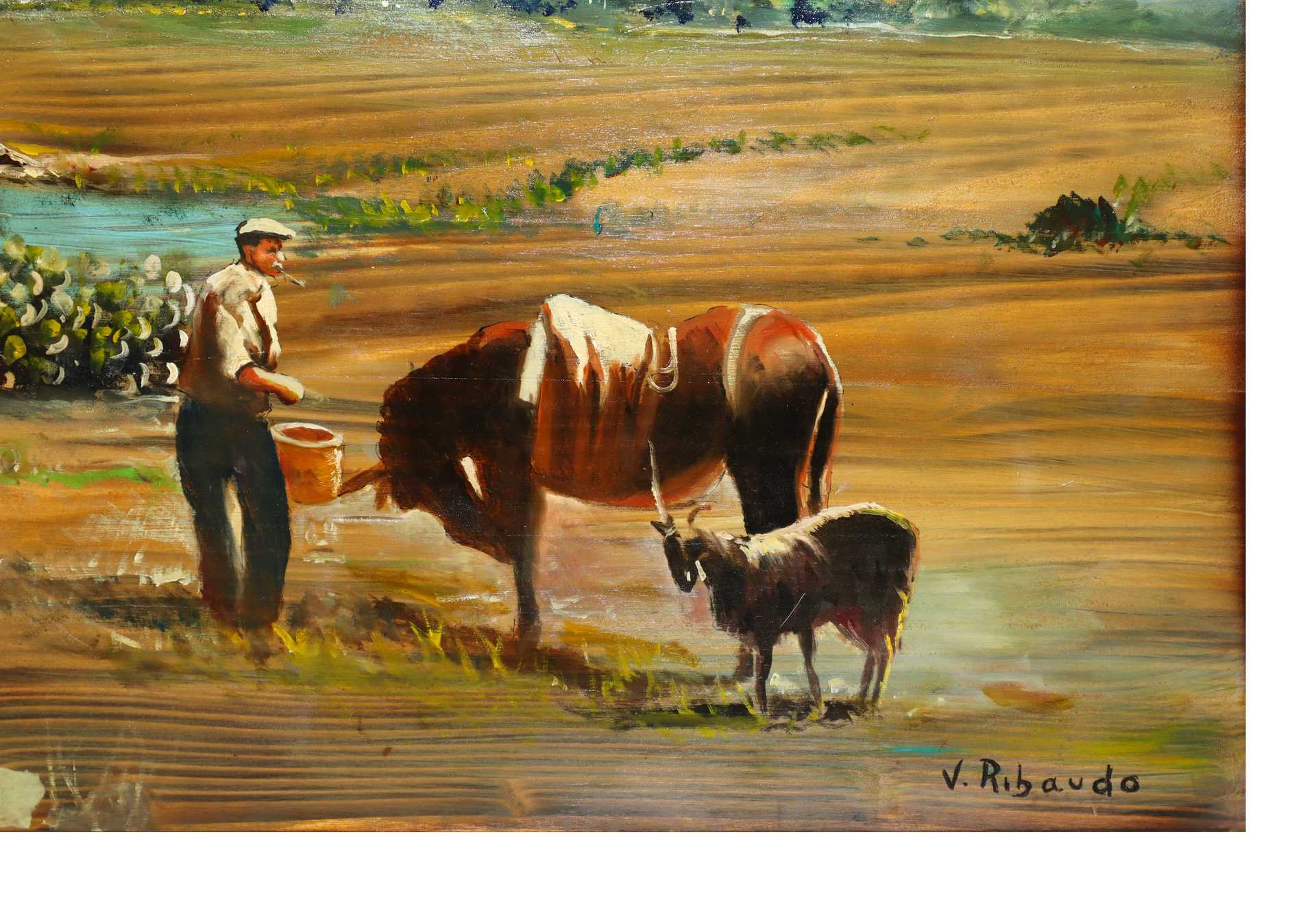 Vittorio Ribaudo (Palermo 1937-2022) - Scena siciliana agreste con vista sull'Etna h cm 40 x 60 olio su legno di abete Vittorio Ribaudo originario di Palermo è diventato famoso poichè realizzava le sue opere non solo su tela ma anche su legno, marmo e pietre preziose, materiali da lui usati per raffigurare le scene della divina commedia. Ha partecipato a parecchie mostre sia in Italia che all'estero.