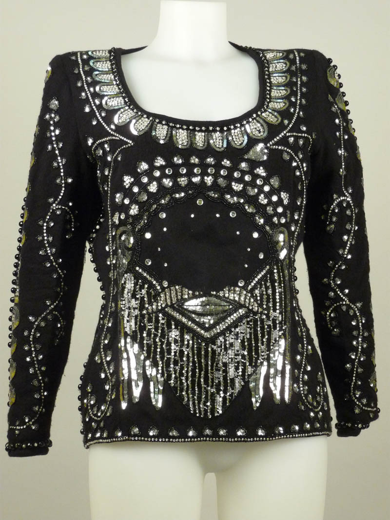 CASACCA DA SERA IN MAGLIA NERA E PAILLETTES - WOOL BLACK SWEATHER Valentino Boutique Anni Novanta impreziosita da motivi figurativi in paillettes nere, argentate, strass e perline, ampio scollo rotondo, manica lunga, cerniera sulla schiena tg M/L circa